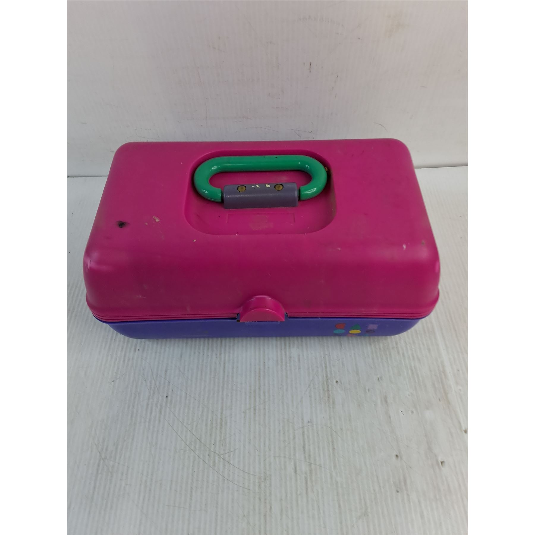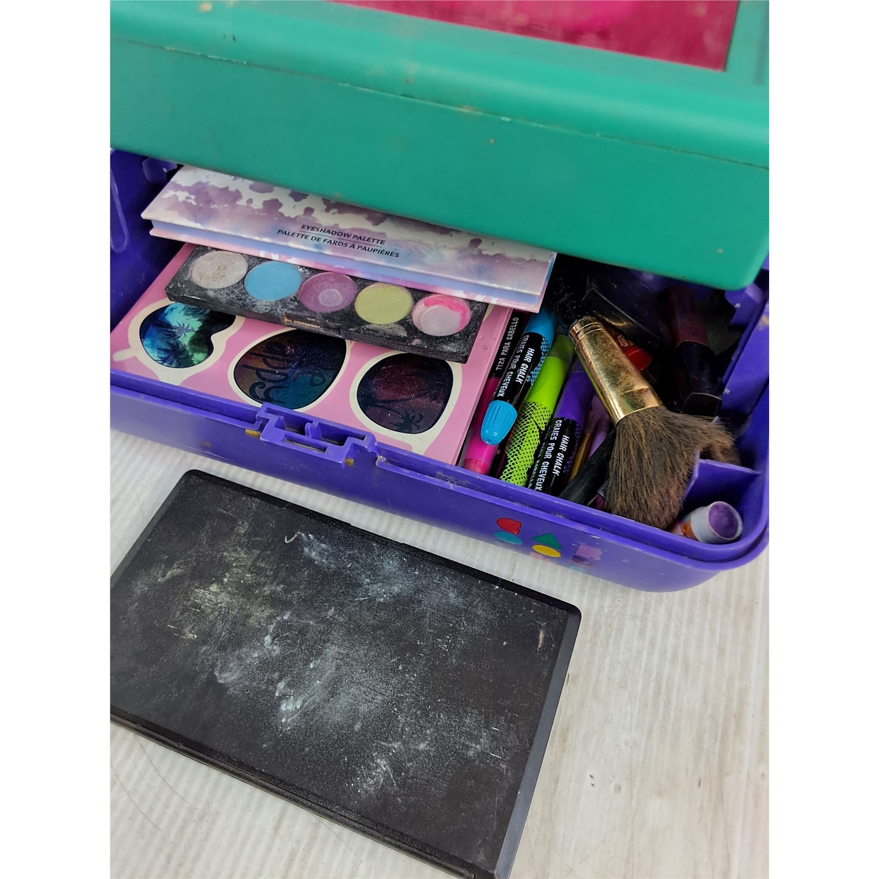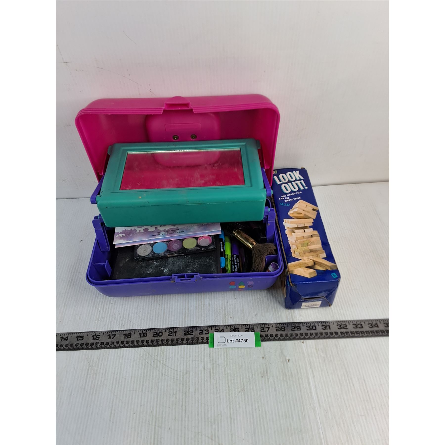Lot 4750 Plastic Bin w/Contents (Makeup, Hair Chalk, Misc.), Wooden Block "Look Out" Game