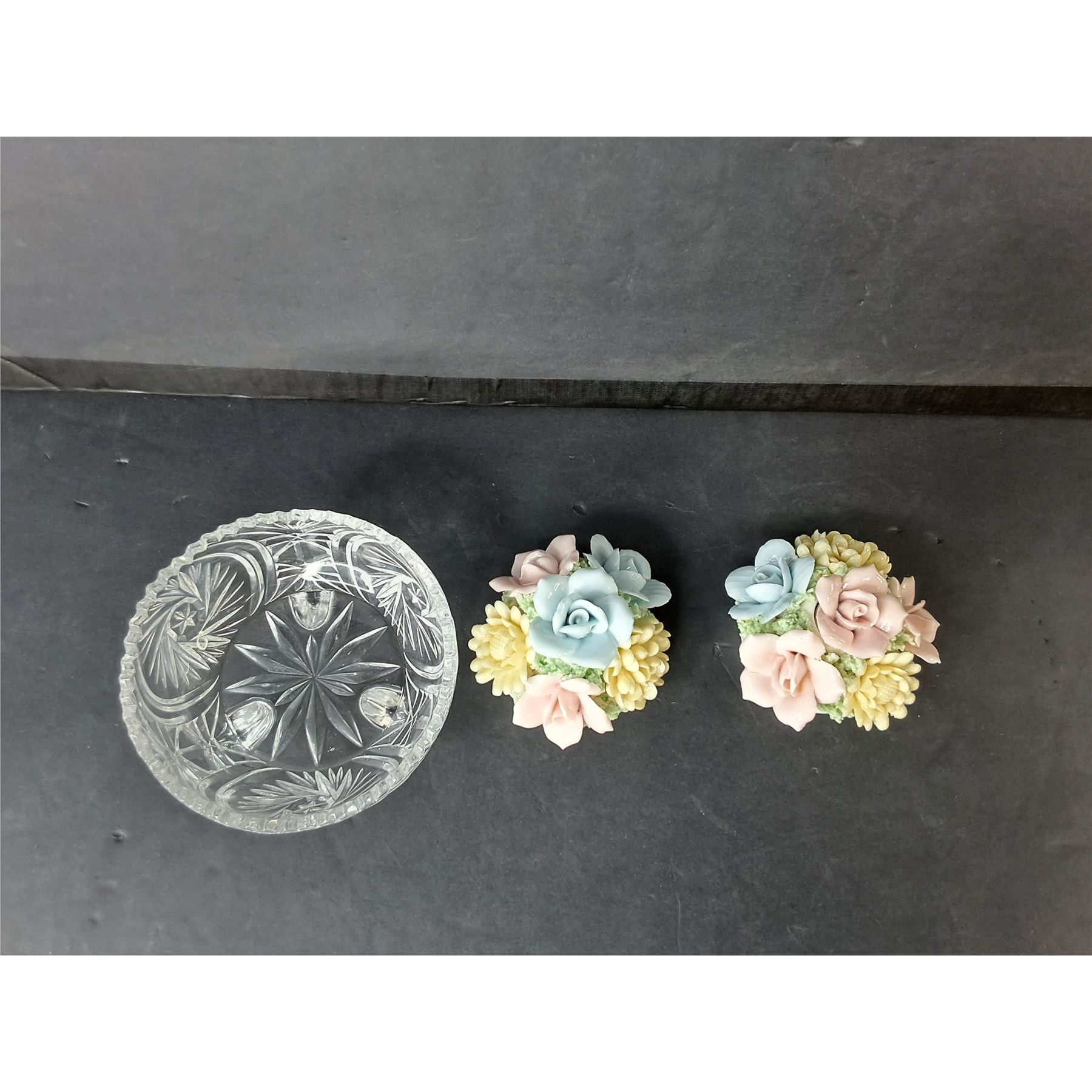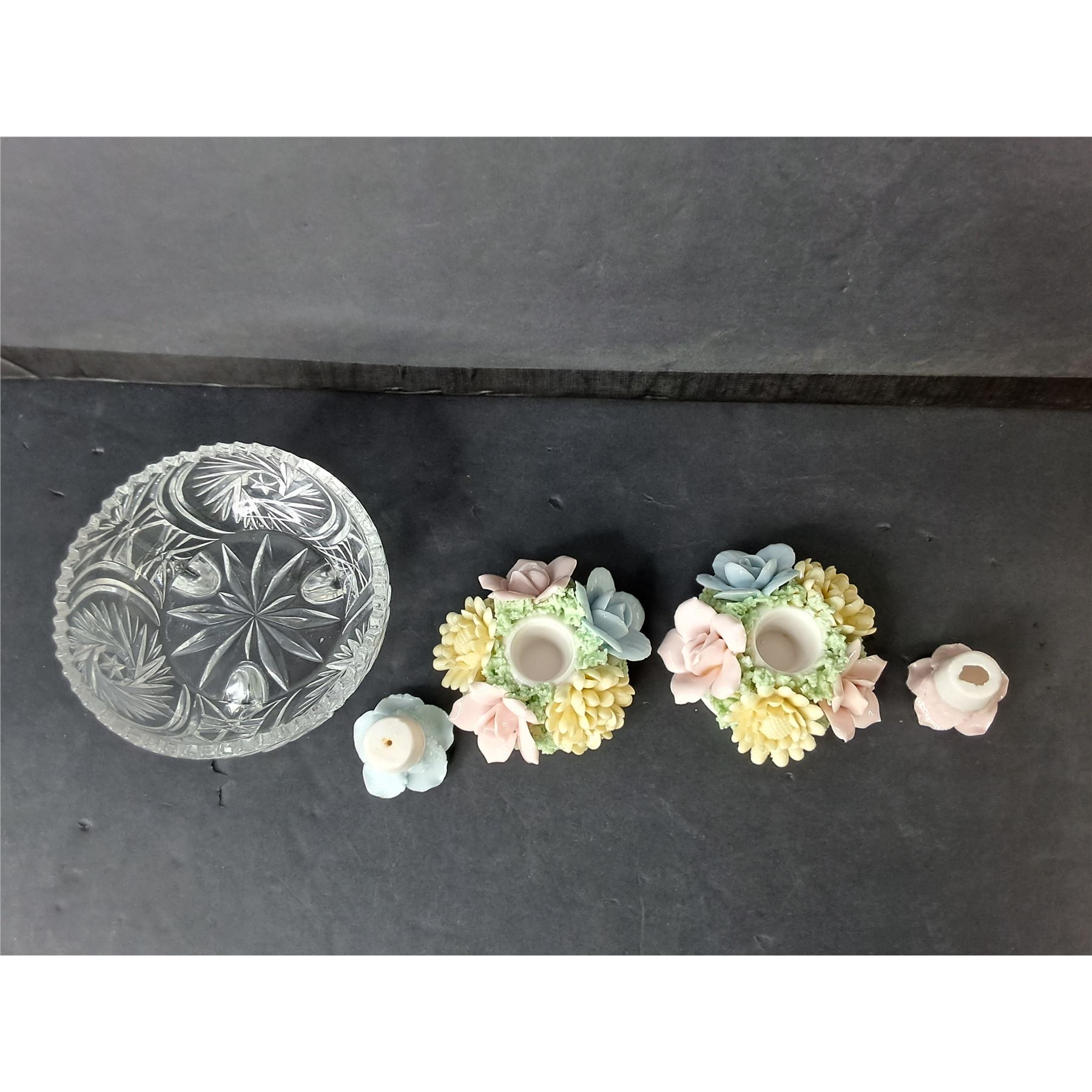 Lot 4765 Footed Glass Candy Dish & (2) Porcelain Floral Candleholders