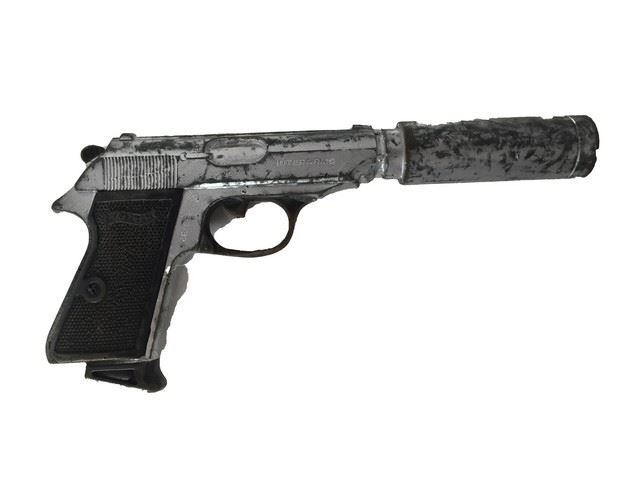 Lethal Weapon 3 (1992)- Jack Travis (Stuart Wilson) suppressed Walther PPK. This is an original, production-made stunt prop of the suppressed Walther PPK intended for use by the film's antagonist, Jack Travis (Stuart Wilson). While the character is famously associated with the "cop killer" armor-piercing bullets fired from a Smith & Wesson Model 19, this suppressed Walther was prepared by the armory department for tactical scenes that did not make the final theatrical cut.Made pf hard rubber.(10"x5")