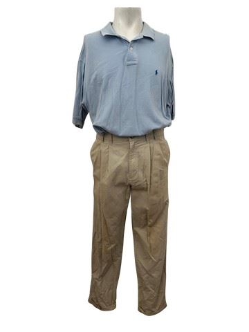 Breakdown (1997) - Jeff Taylor (Kurt Russell) screen worn soiled light blue short sleeve collared polo shirt size xl and Eddie Bauer spiked khaki pants size 32/32.