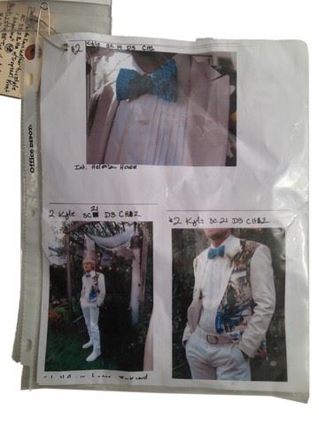 Kyle (Owen Wilson) screen worn, hero, off white "Angelino" suit coat made of artificial leather and is covered in front and back body of the jacket in a bright floral pattern(38), "Zara Man" pants, white, "Kenneth Cole Reaction" shoes white high-tops with white laces blue(11). Worn in the wedding scene. Continuity sheet along with wardrobe tags and wardrobe pictures of Kyle(Owen Wilson).