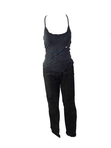 Alice (Milla Jovovich) screen worn, distressed from production green, military cargo coat with patches on both sleeves, faded navy blue tank top, black denim with elastic at the waist with multiple pockets 'Demobaza' jeans. This is the main costume worn by Alice in the film when she is not wearing her catsuit.