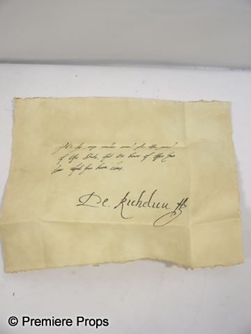 Cardinal Richelieu (Christoph Waltz) screen used, handwritten on parchment paper folded note from the Louvre Garden.