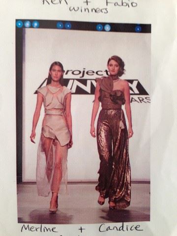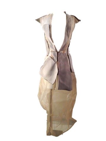Project Runway All Stars - garment # 642- Season 6, Episode 3 -Designer: Merline. This is a sheer nude cap sleeve dress with mesh bottom and nude geometric pieces connected by mesh to comprise the top half of the dress.