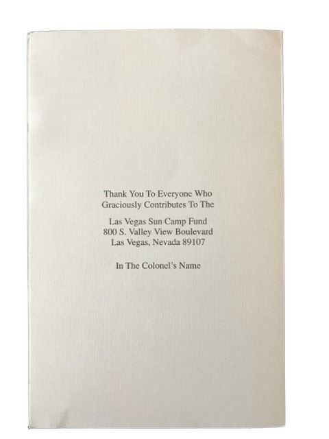 The back of the memorial service program reads: thank you to everyone who graciously contributes to the Las Vegas Sun camp fund, 800 South Valleyview Blvd., Las Vegas, NV 89107. In the Colonel’s name.
