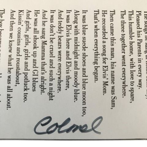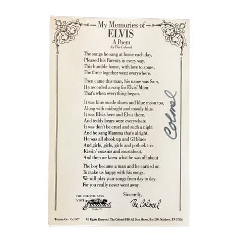 Elvis Presley Memories Poem Page with Hilton Commemorative Postcard. This postcard was distributed in Las Vegas at the famed Hilton hotel. The reverse side features a poem written by Presley's manager, Colonel Tom Parker. Elvis performed more concerts at the Hilton location than any other venue.