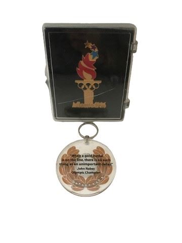 A collectible pin featuring the Atlanta 1996 Olympic Games. Includes a certificate of authenticity. Still wrapped in shrink wrap. Also includes an Olympic keychain game with this quote on the back: “when a gold medal is on the line, there’s no such thing as an unimportant detail“ by John Naber Olympic champion.