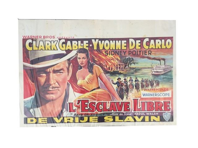 Original mini movie poster for "L'Esclave Libre" starring Clark Gable, Yvonne De Carlo and Sidney Poitier. Warnerscope/Warner Bros productions. Fold creases all over. Noticeable staining at the top. Fine condition. Rolled in plastic cover. (22"x15")