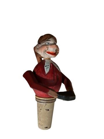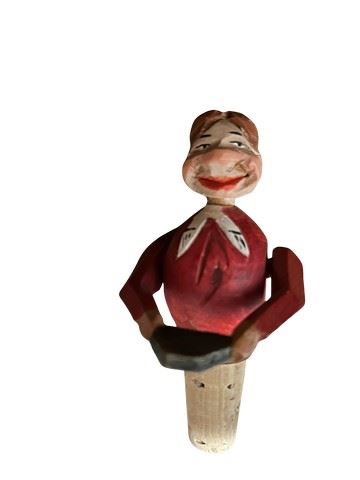 Vintage, hand carved Anri mechanical wine bottle stopper. Made of hand carved and painted wood. It is a collectible folk art item, often depicting a character like a man drinking beer or tipping his hat. Features an articulated, or moving mechanism operated by a lever on the back. Made in Italy by the renowned Anri wood carvers dated to the 1940's-1960s. Designed to fit a standard wine bottle.