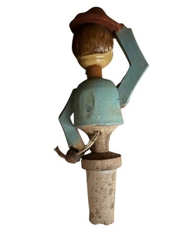 Vintage, hand carved Anri mechanical wine bottle stopper. Made of hand carved and painted wood. This depicts a man who tips his hat when a string on the back is pulled down. Made in Italy by the renowned Anri wood carvers dated to the 1940's-1960s. Designed to fit a standard wine bottle.