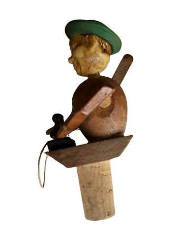 Vintage, hand carved Anri mechanical wine bottle stopper. Made of hand carved and painted wood. This depicts a man who is putting a phone to his ear when the lever in the back is pushed down. Made in Italy by the renowned Anri wood carvers dated to the 1940's-1960s. Designed to fit a standard wine bottle.