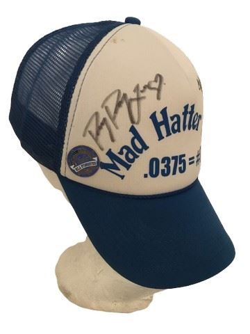 Blue and white mesh trucker hat marked Mad Hatter math .0375 equals #1. Includes UCLA gymnastics national champions button in gold button with blue enamel pin. Signed by Miss Val and one other signature.