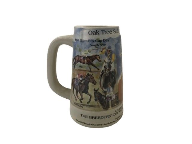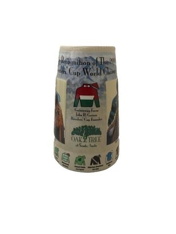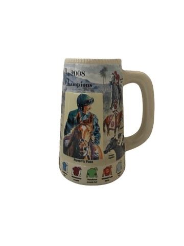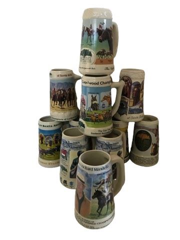 Lot of 12 limited edition Santa Anita Park Stein mugs, commission by Oak Tree Racing Association. Mugs feature colorful artwork honoring horses and jockeys from several races in cups between 1999 and 2008.