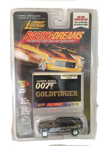 James Bond 007 Johnny Lightning Racing Dreams Hollywood Series, Goldfinger 1:64 scale die cast race car with bonus logo card. From a one-time production run. 1998, Playing Mantis.