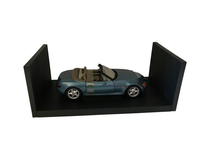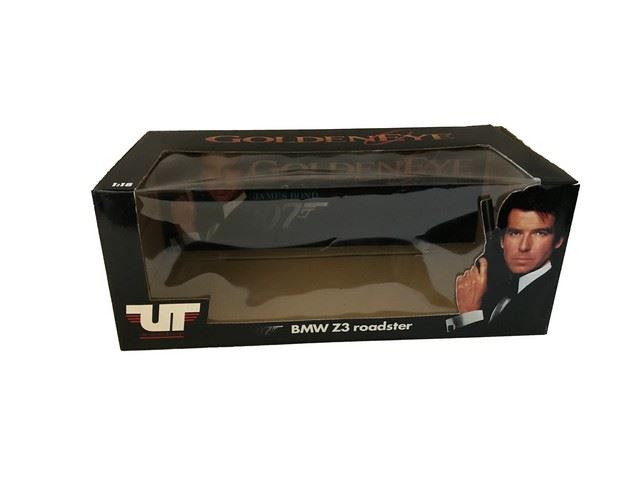 Goldeneye BMW Z3 roadster - Unique Toys Model- 1:18 scale. Made by Paul's Model Art GmbH, Germany, 1995. New in box. Box is slightly ripped and wrinkled in the back with a piece of tape holding the sides closed. Removed from the box only for photograph. (12"x5"x7")