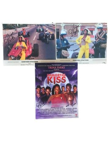 Three signed photos from Trina Parks personal collection featuring publicity stills from her starring roles in the films "Darktown Strutters" and "Immortal Kiss" Trina Parks was the first African American singer and dancer featured in the Palm Springs Follies for 6 years from 2002-2008. (photos range slightly in size, most are approx. 8 1/2" x 11)