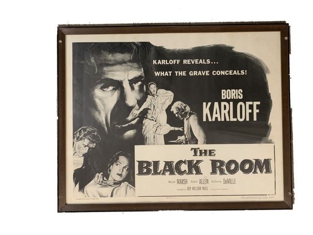 "The Black Room" (1955) starring Boris Karloff framed, black and white poster. This poster once hung on the walls ot the Debbie Reynolds Dance Studio. Numbered R55/19.