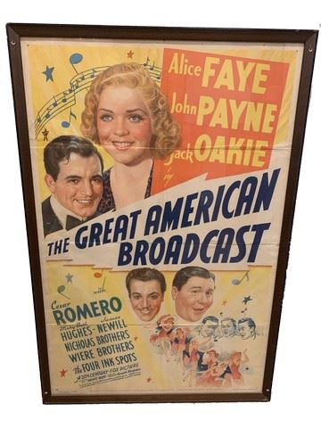 "The Great American Broadcast" starring Alice Faye, John Payne and Jack Oakie framed, original Litho movie poster. Poster has been protected by the frame for many years as this hung on the walls of the Debbie Reynolds Dance Studio. Litho #5881. Note: We can look into removing the frame from this item to save money on shipping charges.