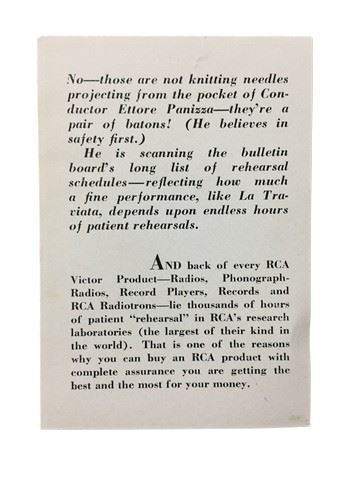 Two sets of rare and vintage promotional items (~24) from the Metropolitan Opera ca. 19th Century (approx. 4 x 3 in). These are exclusive candid camera shots of the Great Stars of the Metropolitan Opera, RCA Victor stars of the opera Die Walküre and La Traviata. These rare black and white photographs are printed on paper and verso is a caption about the image. There are images of famous stars as well as images of those connected with the productions such as: "Die Walkure" with Lucrezia Bori, Milton Cross, Kirsten Flagstad, Ludwig Hofmann, Lauritz Melchior, Friedrich Schorr, Jose Ituri (conductor). The stars and those connected with the production of "La Traviata" are Vina Bovy, Lucielle Browning, Nino Martini, Ettore Panizza (conductor), John Charles, Thomas, Thelma Votipka. All camera shots are in very good condition and come in the original blue and green envelopes. There is water damage, holes and tears to the envelopes. Flaps are missing. Printed on the envelope of La Traviata is “Form 2697 and Printed in the U.S.A. “ Printed on the information card and the envelope of Die Walküre is “Form 2698 and Printed in the U.S.A.“