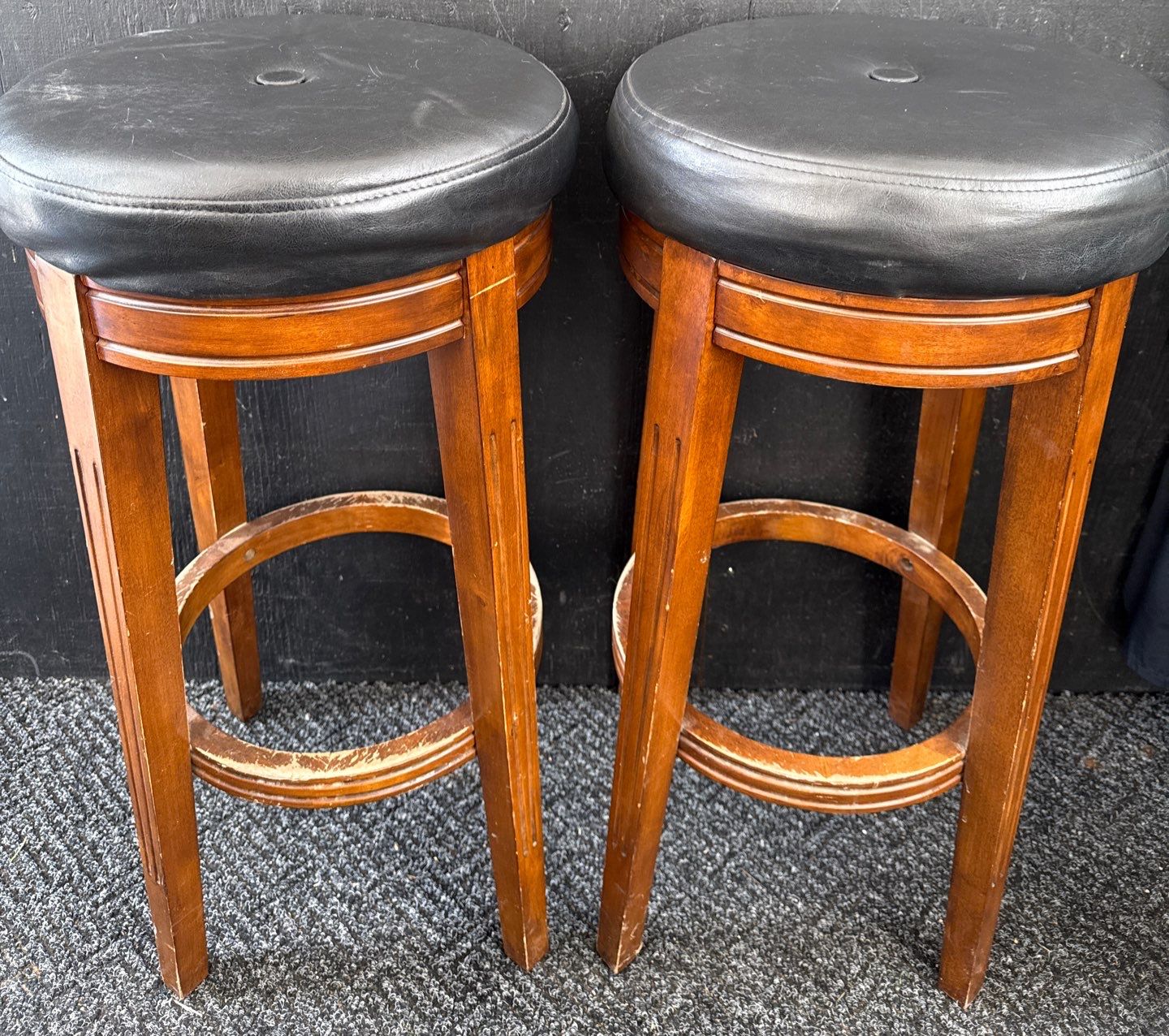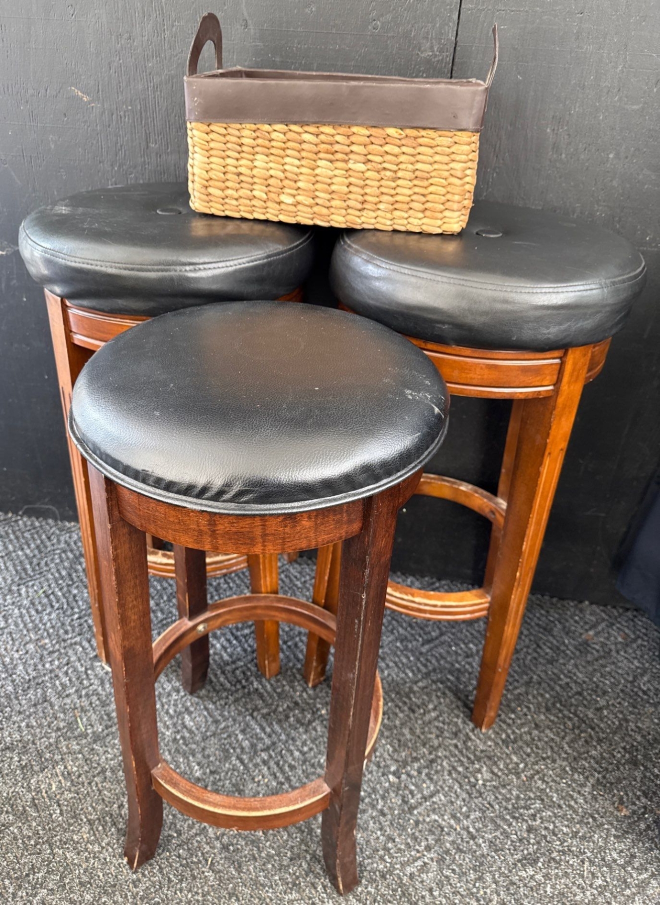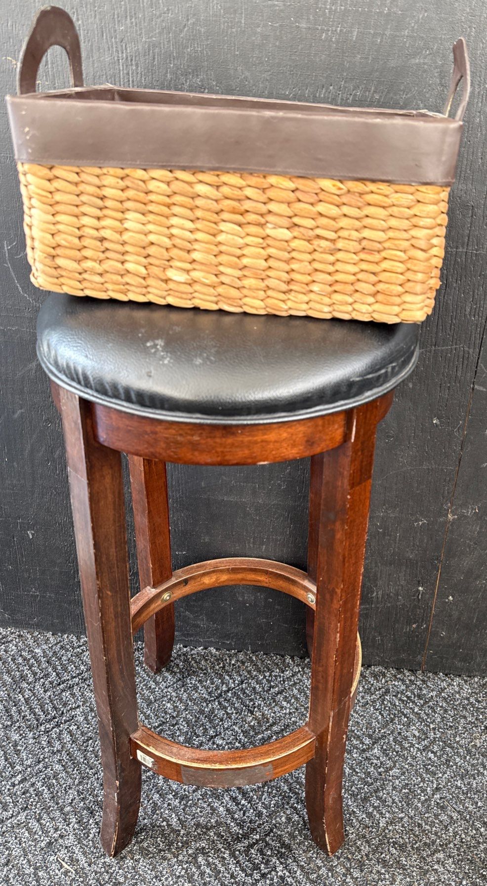 Lot 27 3 Oak Bar Stools w/ Genuine Leather Upholstery & Decorative Woven Basket 30'Tall