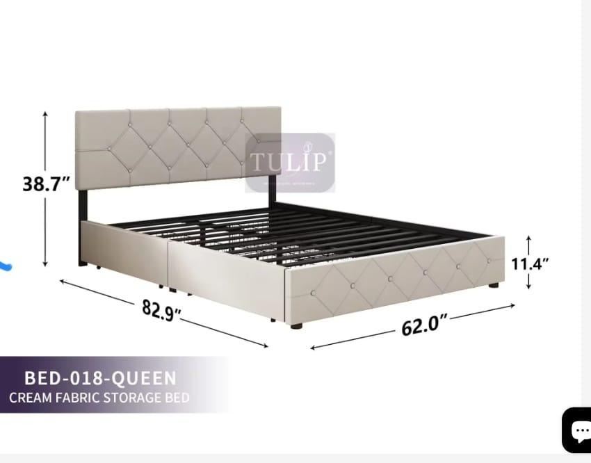 Brand new Tulip Bed frames- New in Box (Cream Fabric) Size- 018 Queen Storage bed Retail Price- $500