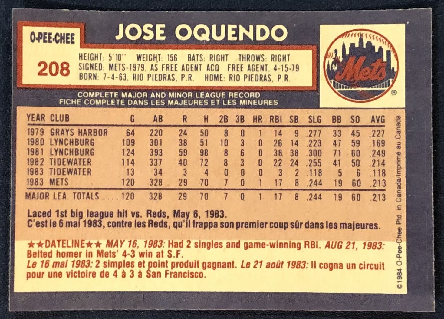 Lot 162 1984 O-PEE-CHEE JOSE OQUENDO ROOKIE CARD