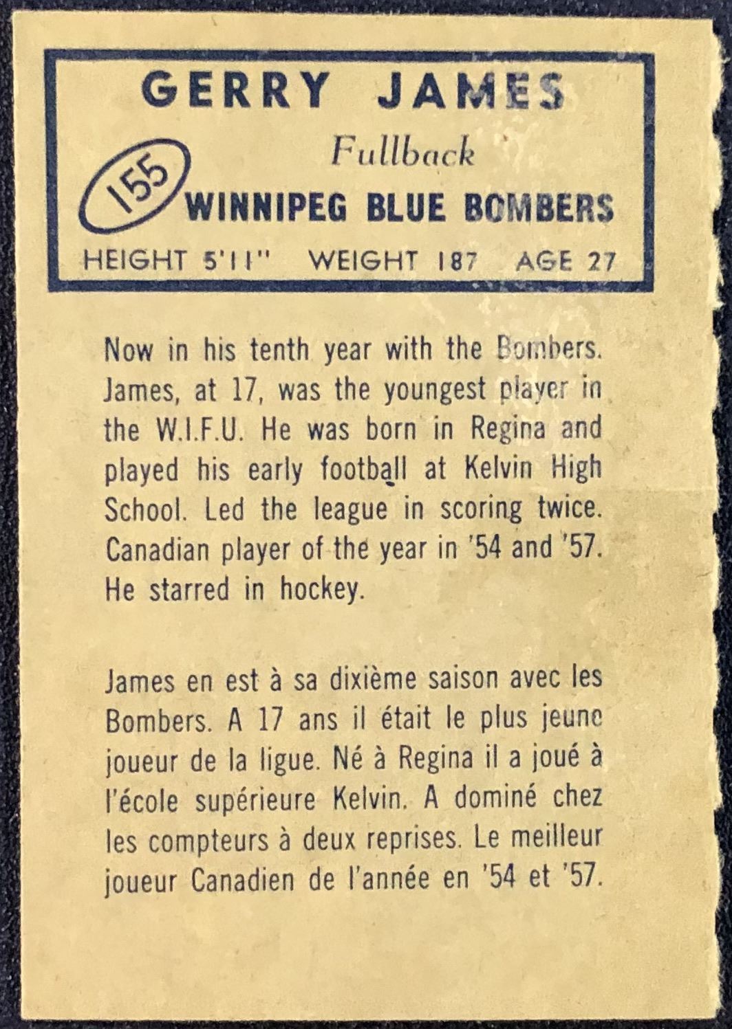 Card #155 vintage, CFL, football, hall of fame