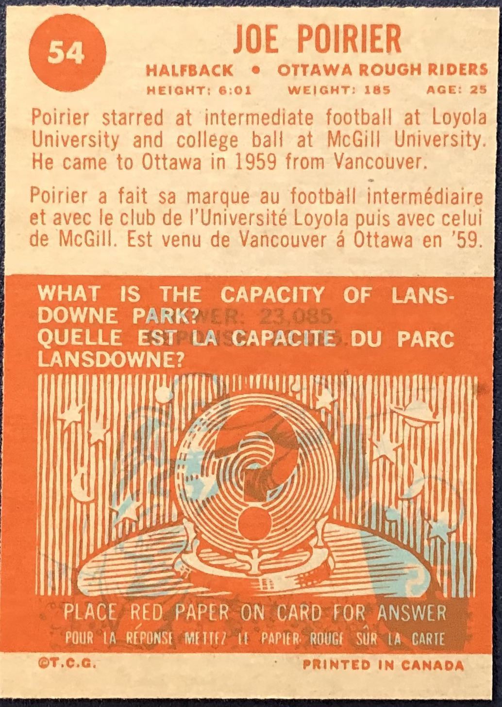 Card #54 vintage, CFL, OPC, football, hall of fame
