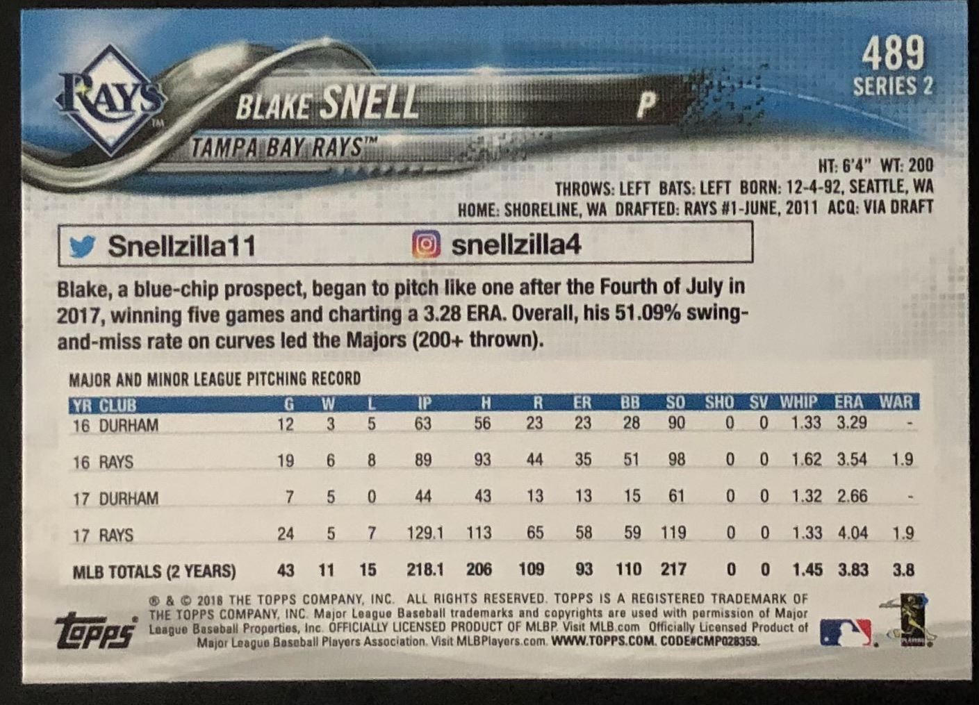 Lot 390 2018 TOPPS BLAKE SNELL