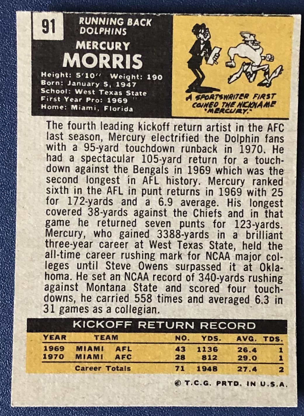 Lot 517 1971 TOPPS MERCURY MORRIS ROOKIE CARD