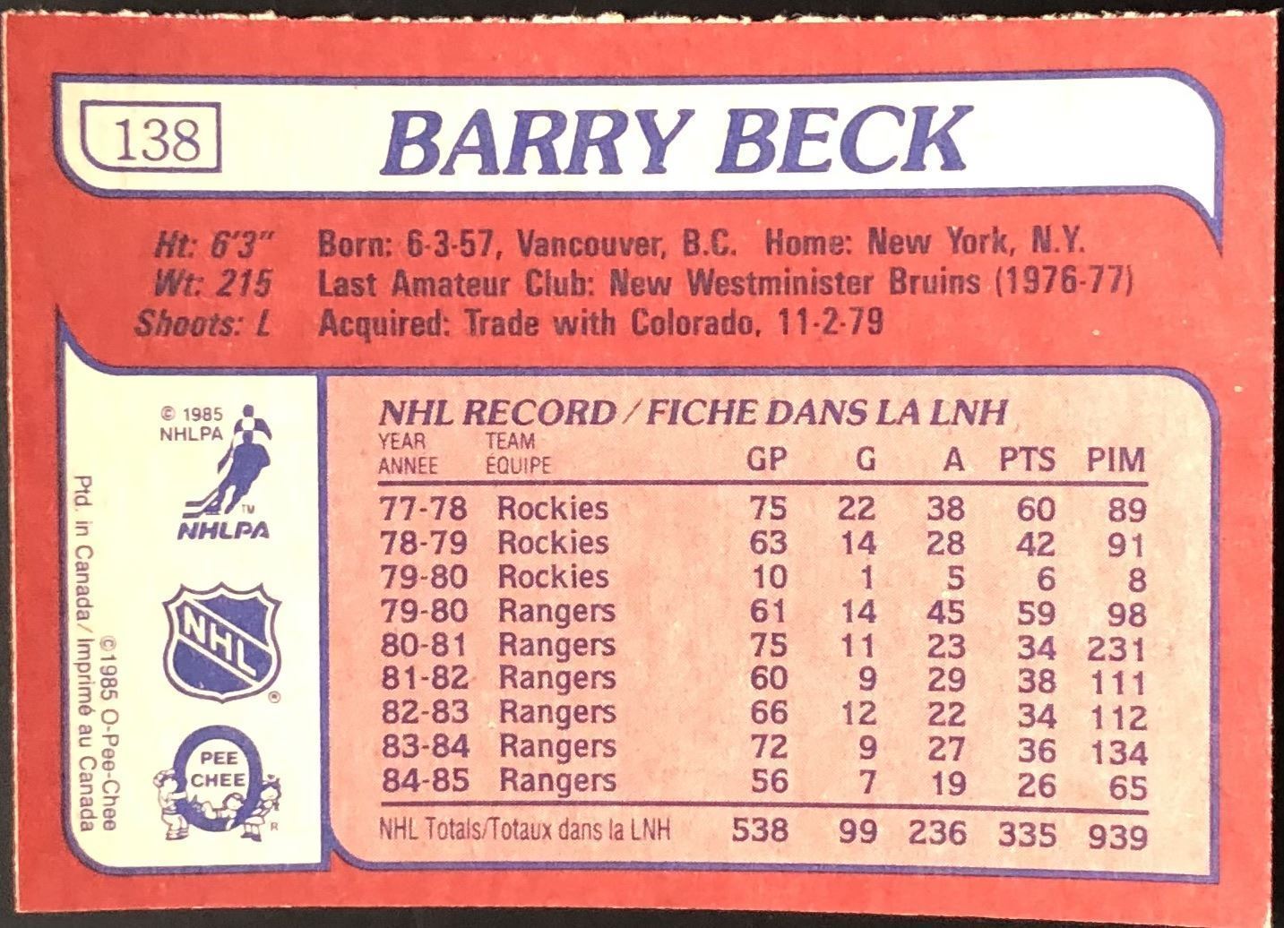 Lot 667 1985-86 O-PEE-CHEE BARRY BECK