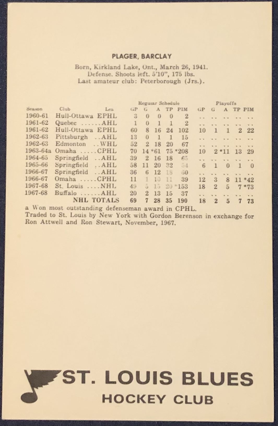 Lot 733 1968 ST. LOUIS BLUES 3.5"x5.5" POSTCARD - BARCLAY PLAGER