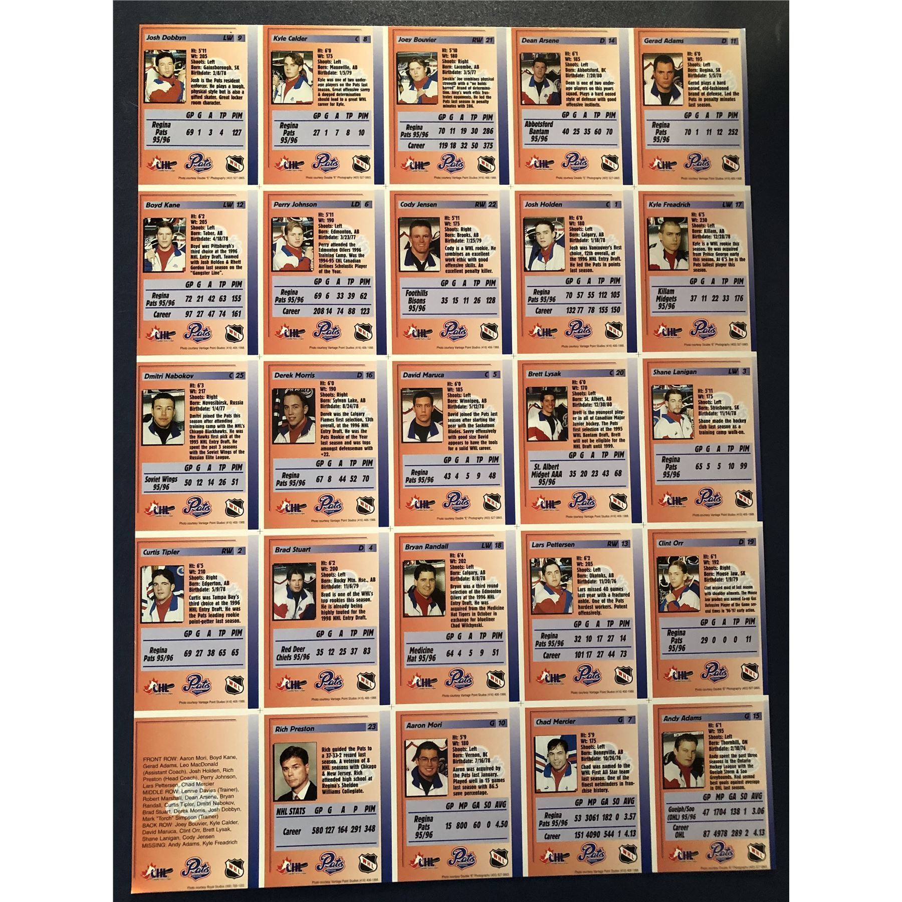 Lot 827 1996-97 REGINA PATS (WHL) POLICE SET UNCUT SHEET