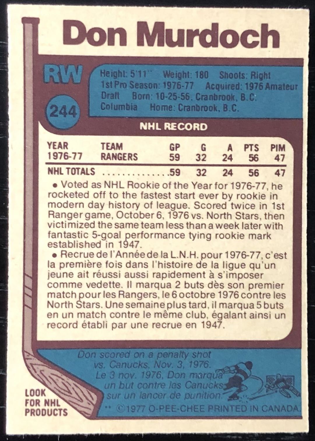 Lot 1300 1977-78 O-PEE-CHEE DON MURDOCH ROOKIE CARD