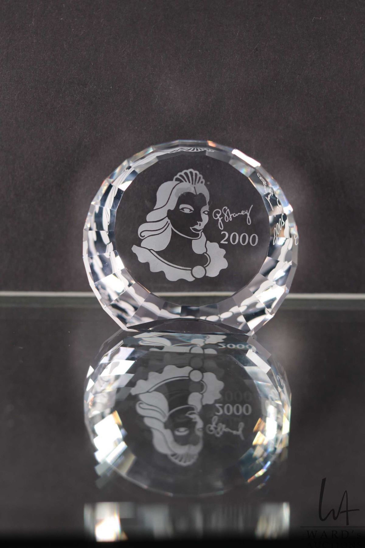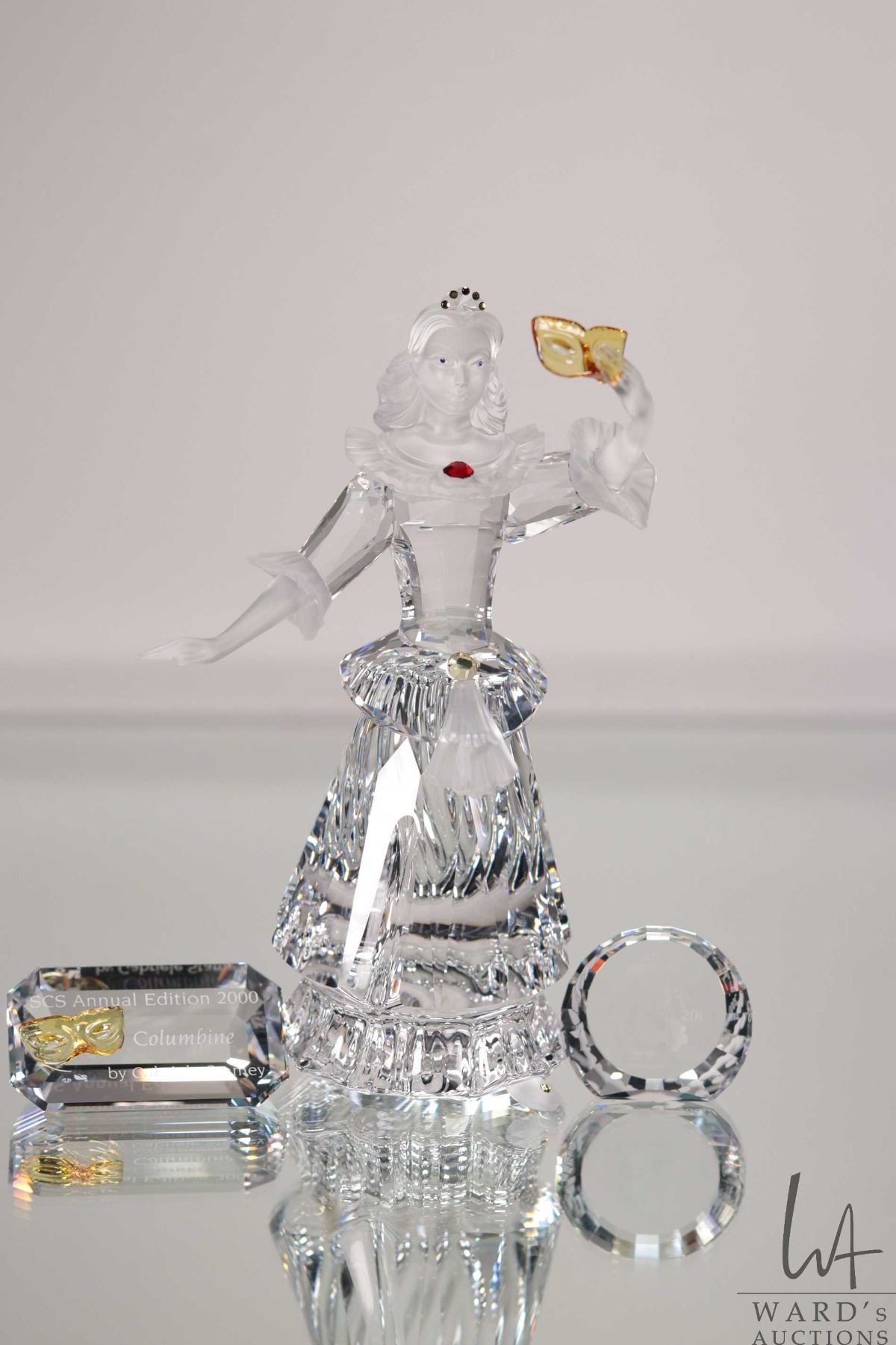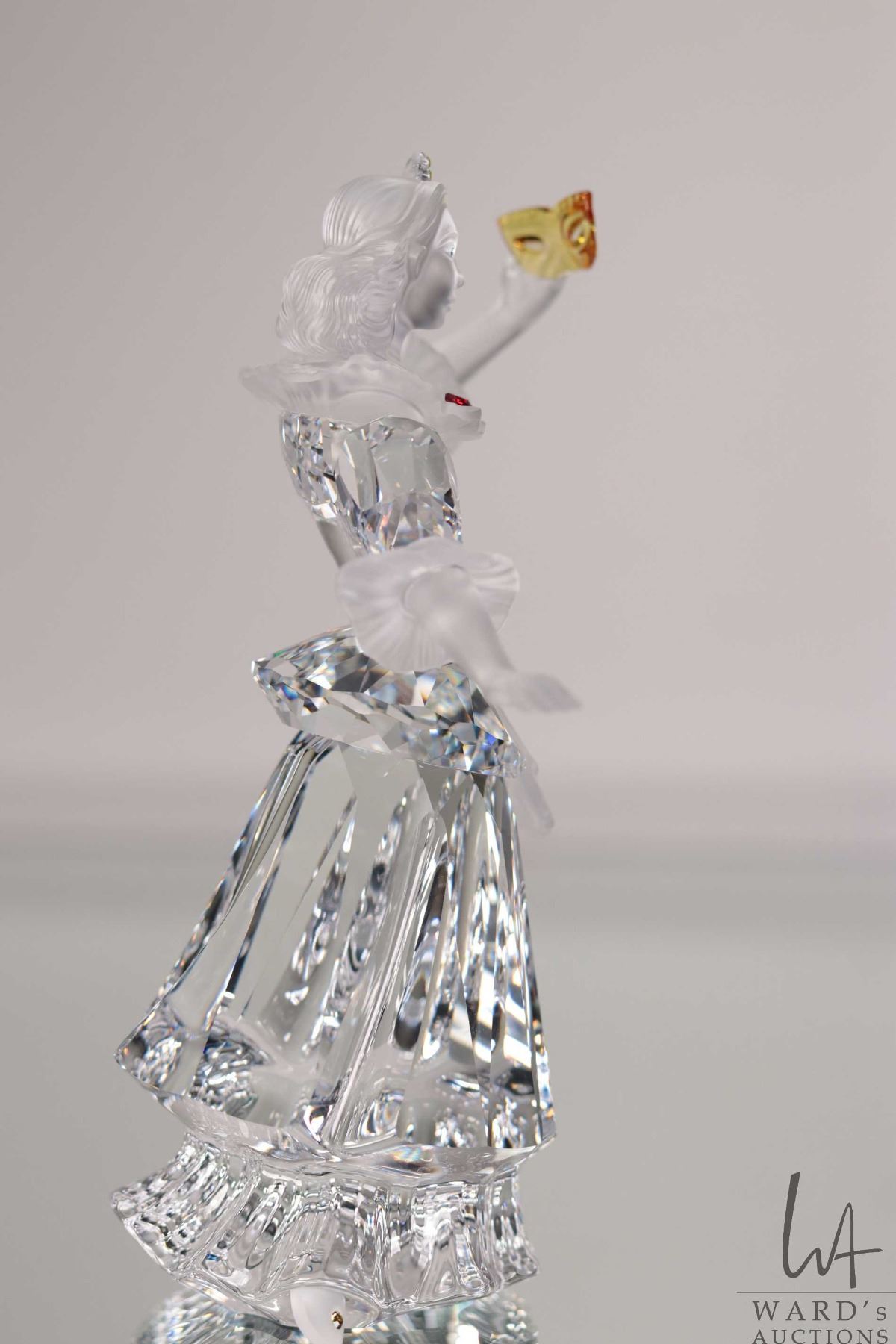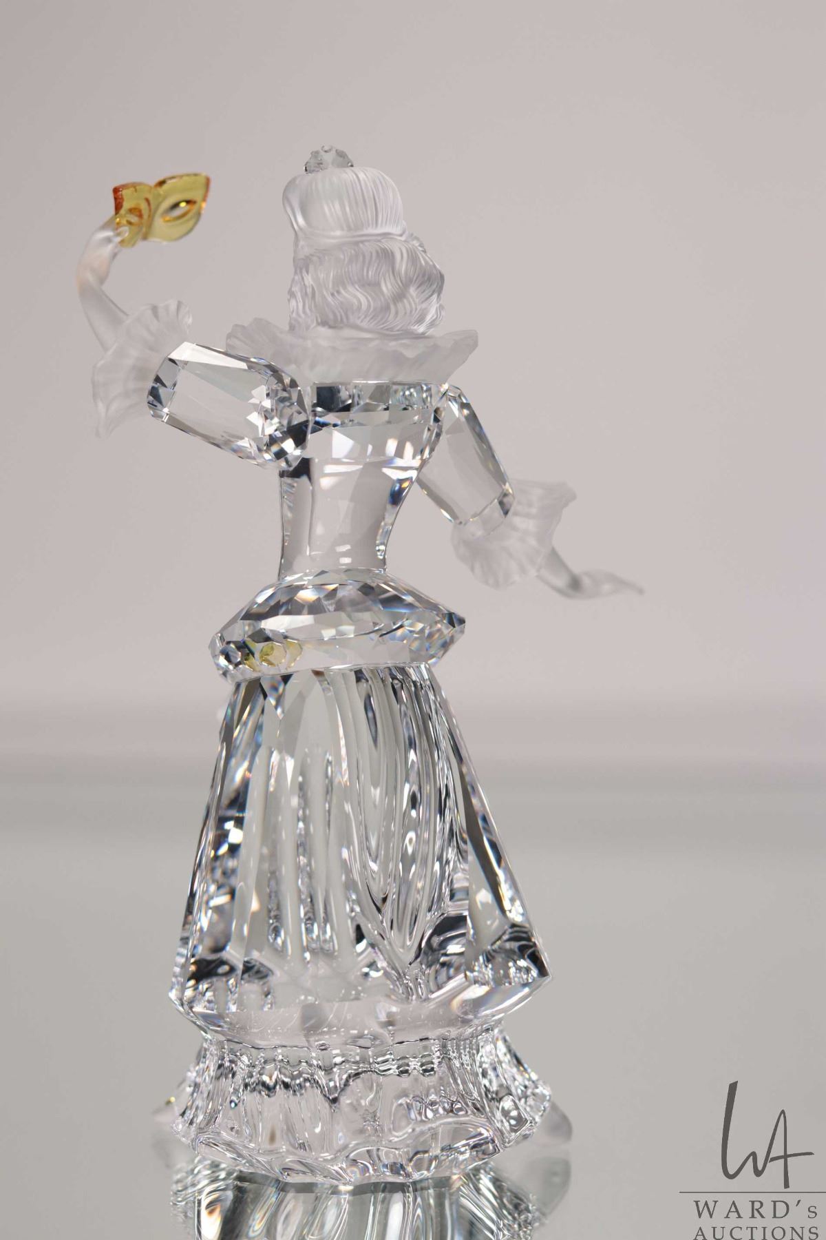 Swarovski crystal "Columbine" no. 242032, 6 1/2" in height. From the 2001 Masquerade Trilogy. Includes figure, a base and two crystal plaques plus original boxes