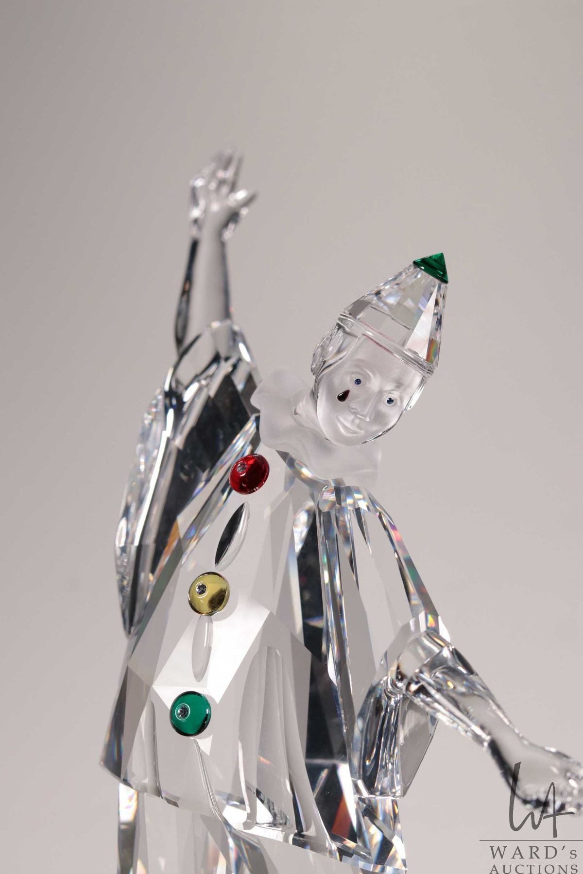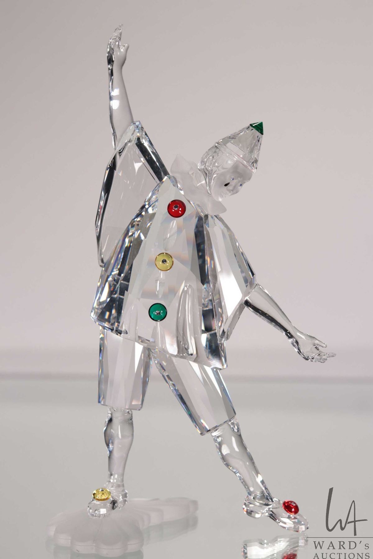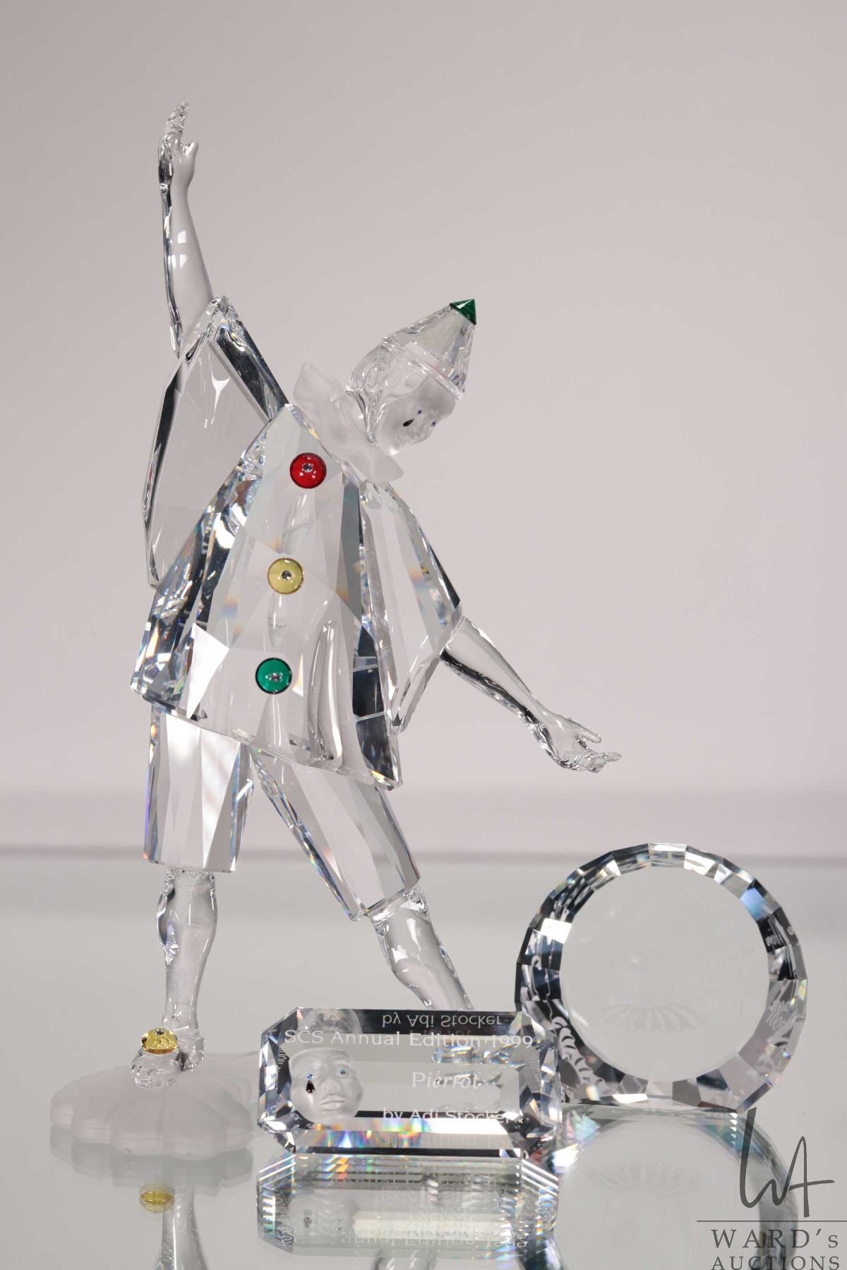 Swarovski crystal "Pierrott" no. 23586, 8" in height. From the 2000 Masquerade Trilogy. Includes figure and two crystal plaques plus original boxes