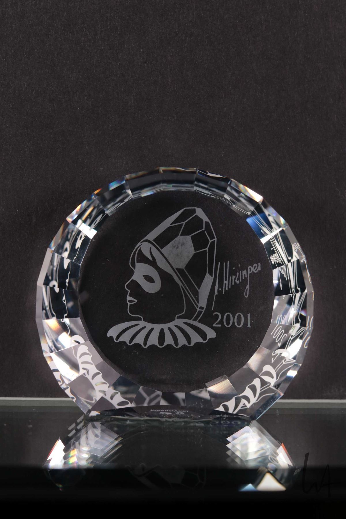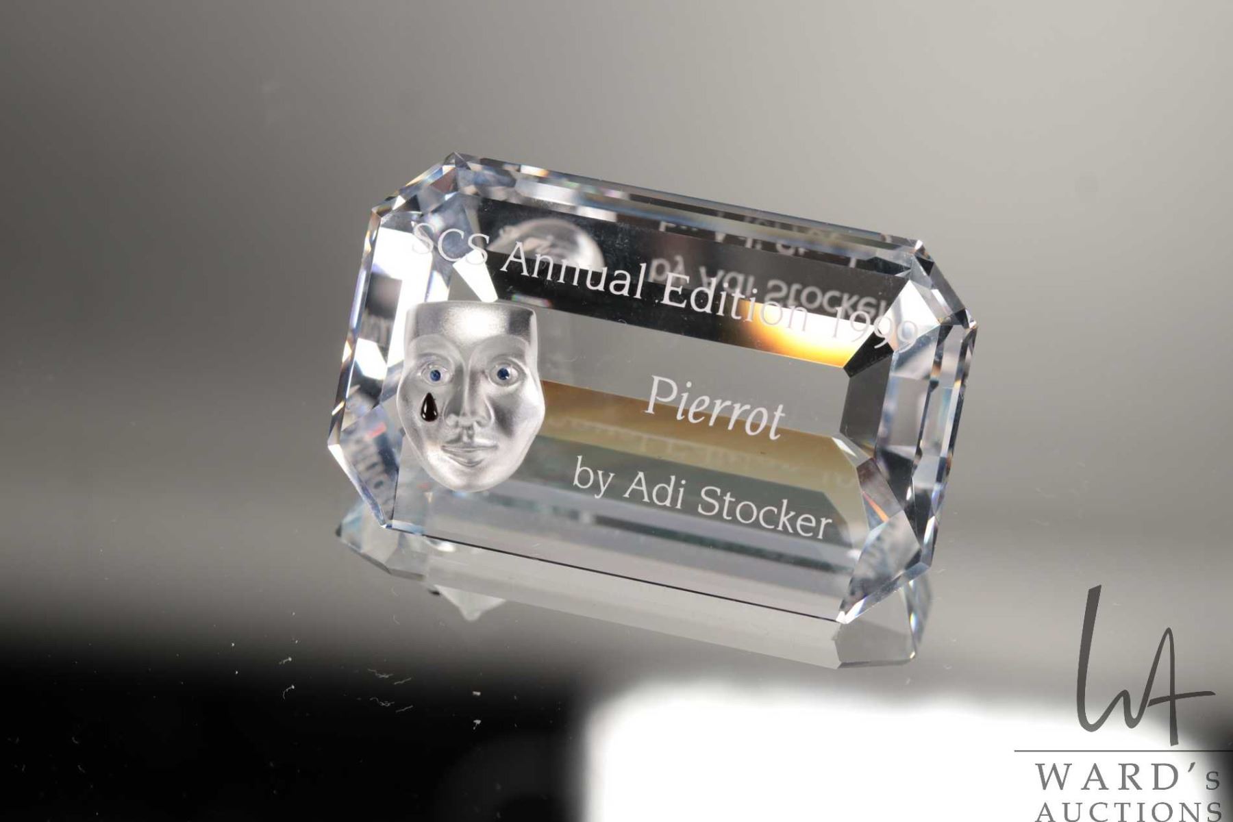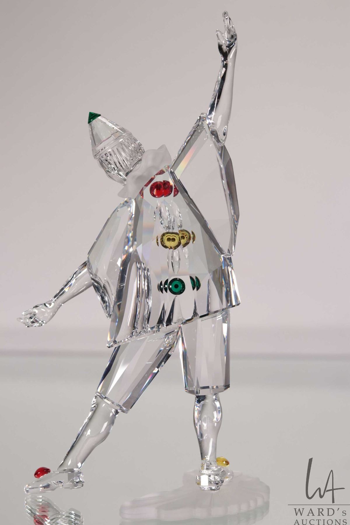 Swarovski crystal "Pierrott" no. 23586, 8" in height. From the 2000 Masquerade Trilogy. Includes figure and two crystal plaques plus original boxes