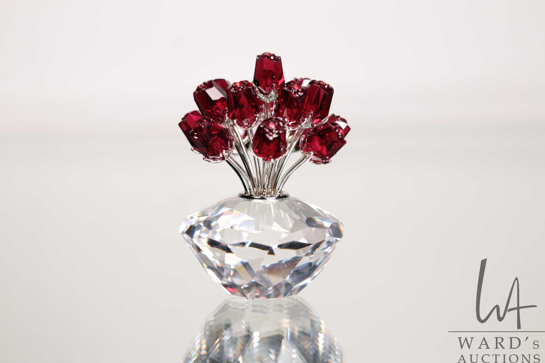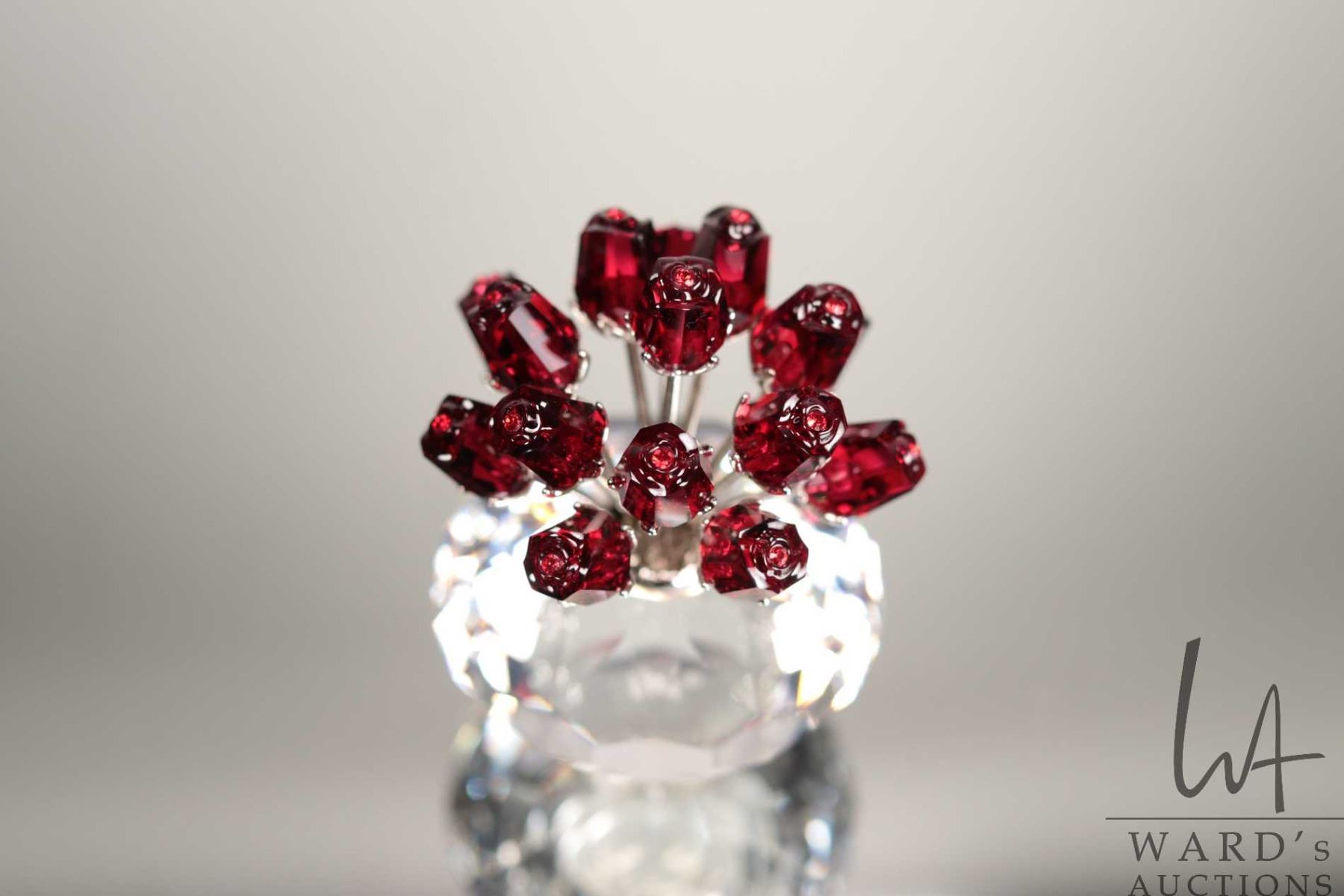 Lot 4 Swarovski crystal vase of red roses. no. 283394, 2 3/4" in height. Designed for the 15th anniversary