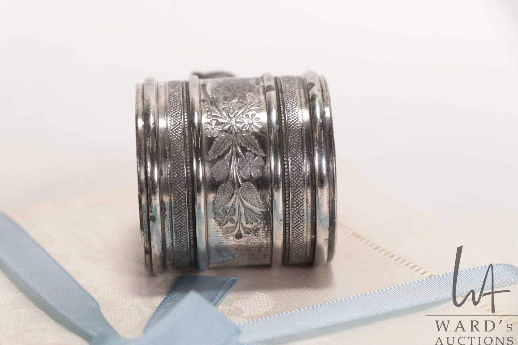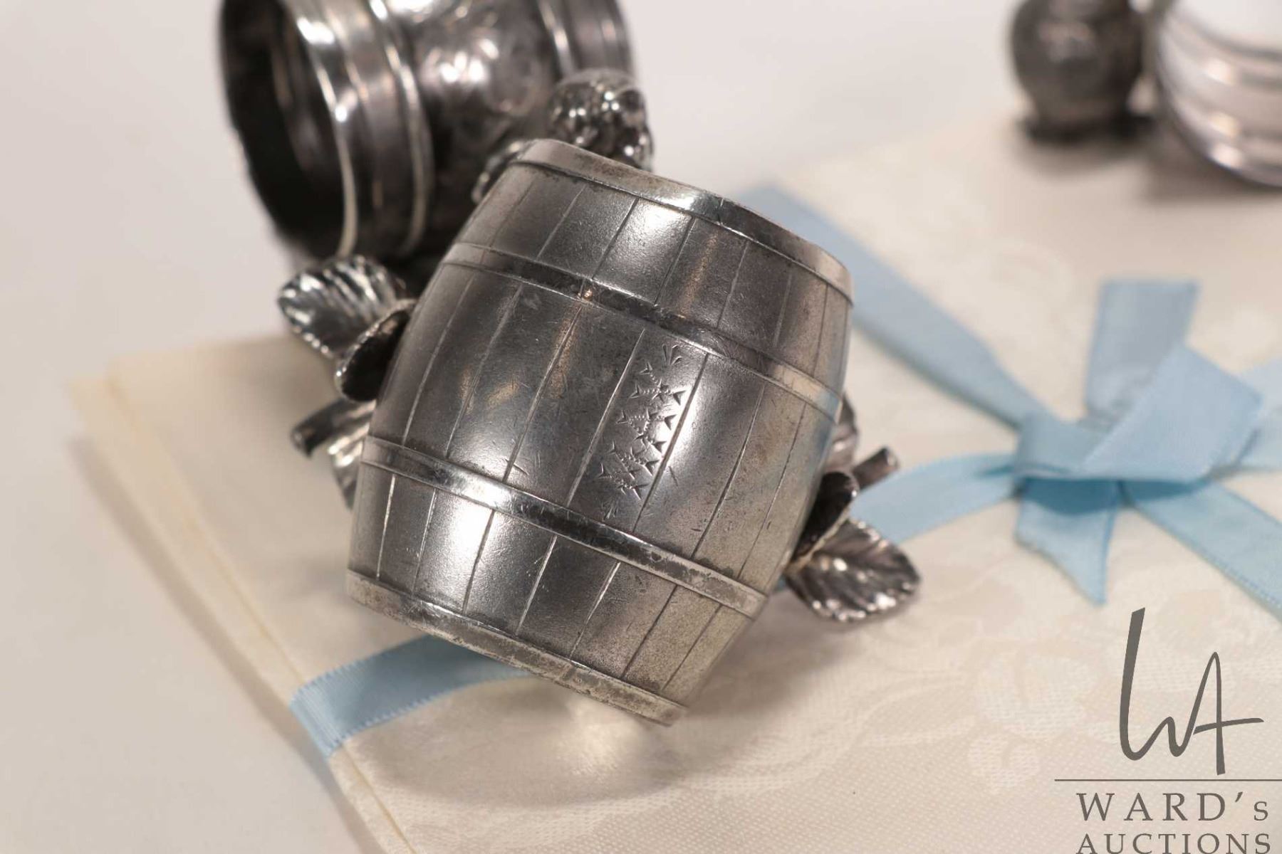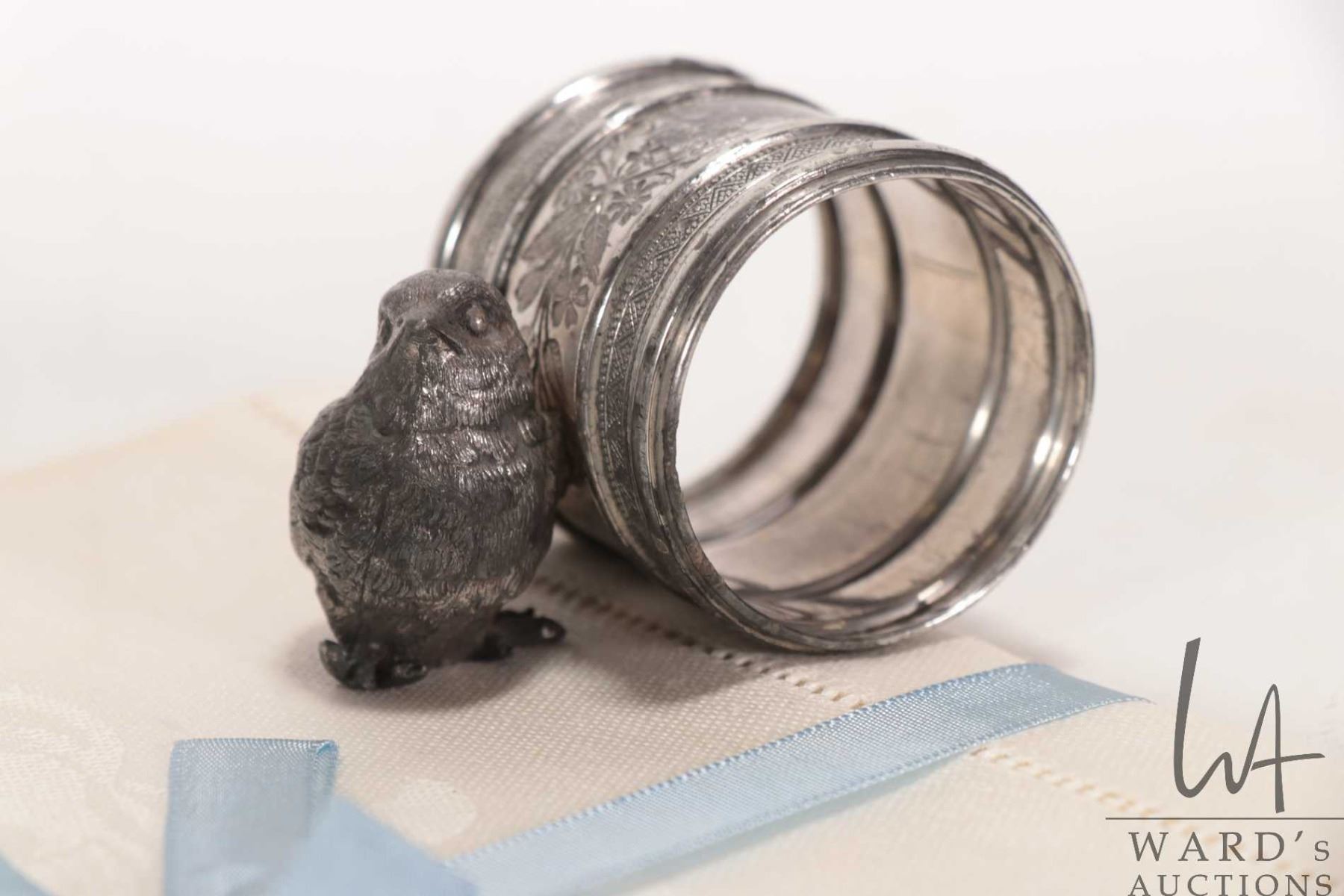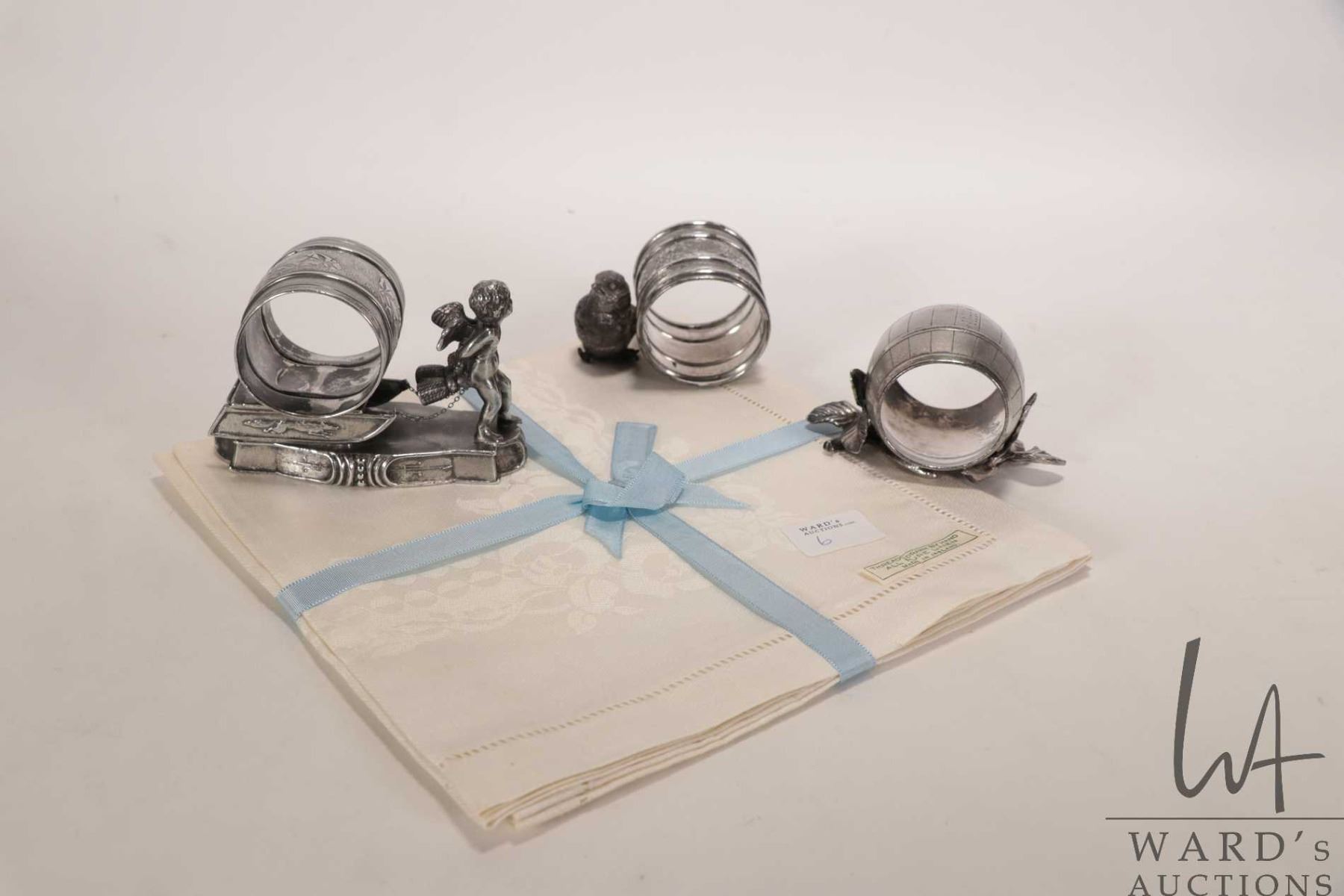 Three antique Victorian silver plate napkin holders including cherub pulling a sledge, Easter chick and a barrel with twigs and leaves plus four Irish linen napkins