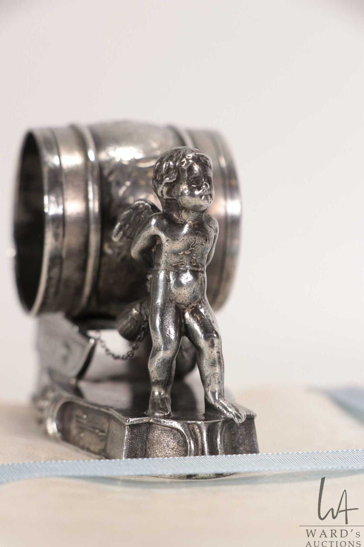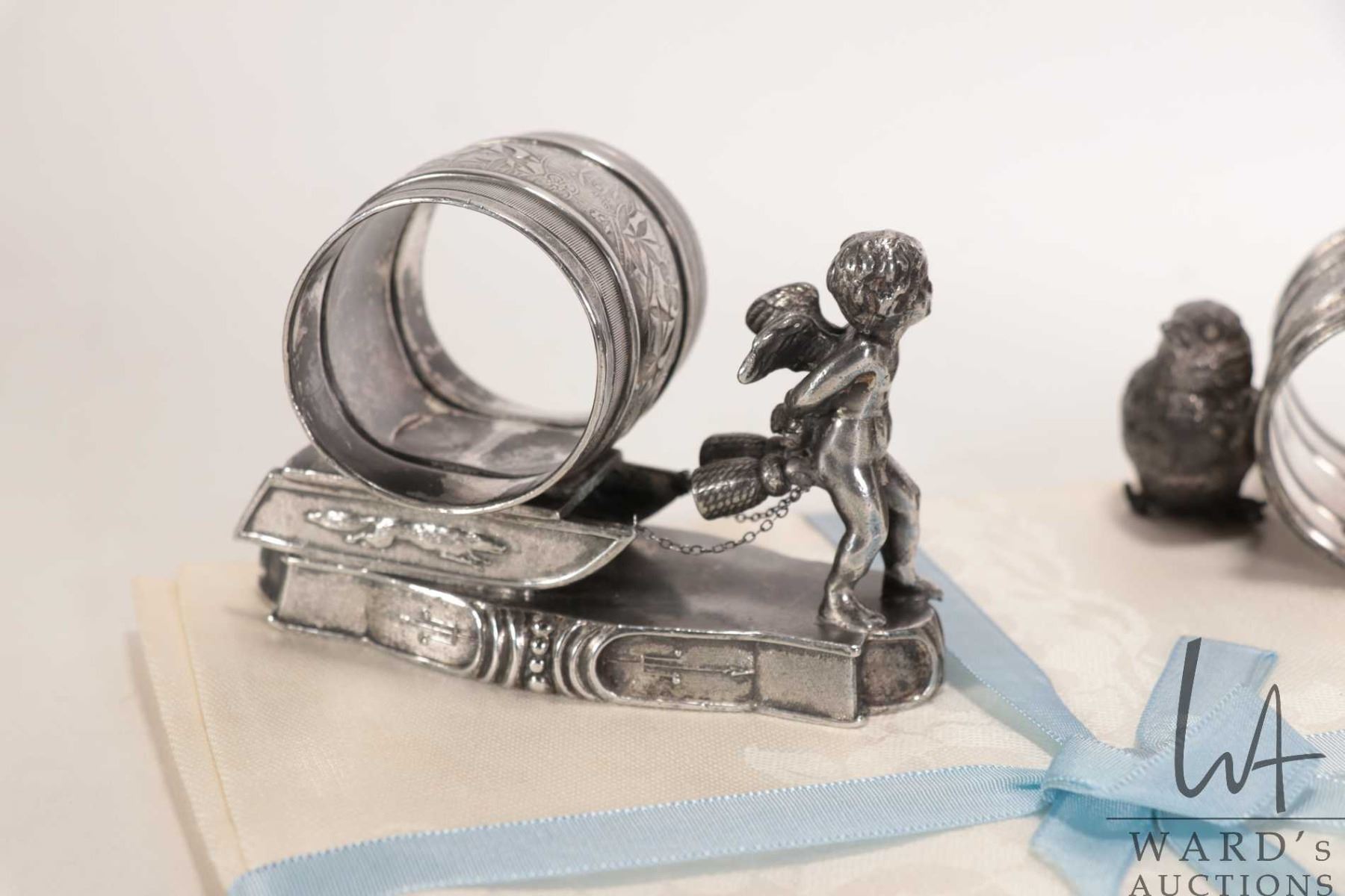 Lot 6 Three antique Victorian silver plate napkin holders including cherub pulling a sledge, Easter chick