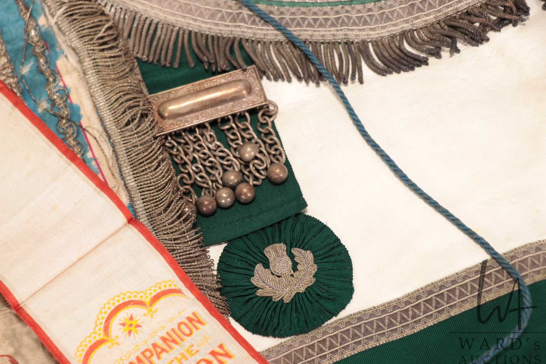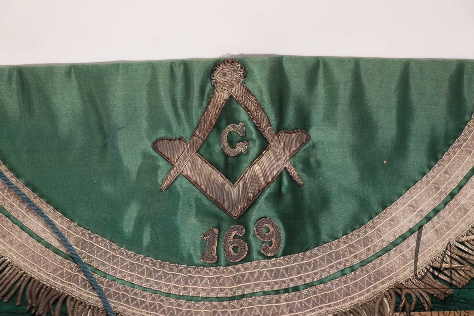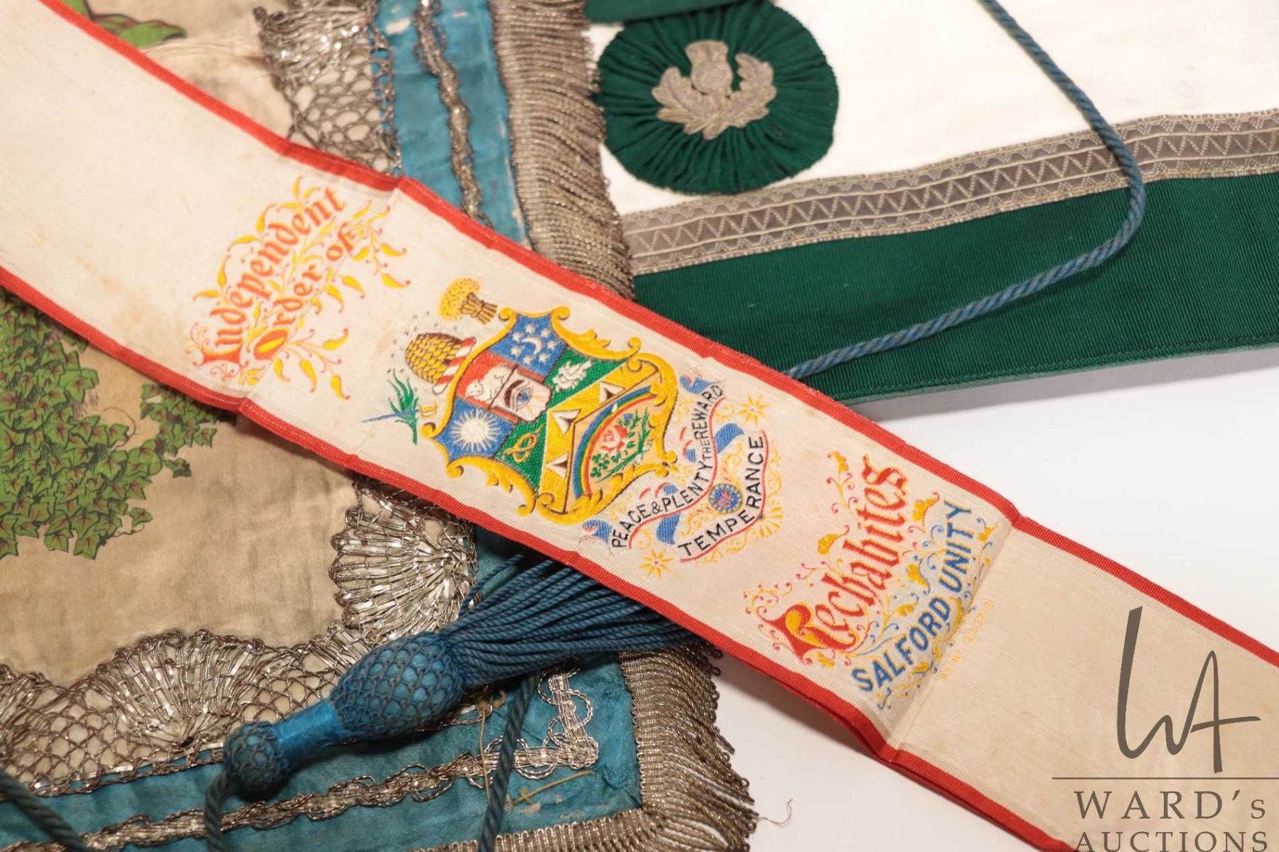 Selection of Regalia including antique Masonic kid leather and silk apron, decorated with silver thread fringing, silver-plate scroll work buckles and ball and chain tassels plus silver metallic bullion thread embroidered " G", compass and "169" with thistle and rose florettes ( a connection to Lodge Stivenstoune Thistle and Rose No. 169, a Masonic Lodge under the Grand Lodge of Scotland started in 1787) plus a silk fraternatiy banner from the Oddfellow ( Independent Order of Manchester Unity) Society, decorated with silver metallic bullion thread and silk tassels and an embroidered sash from the Independent Order of Rechabites ( a friendly society that promoted teetotalism) Salford Unity division, featuring silk embroidered and a metallic bullion tassel