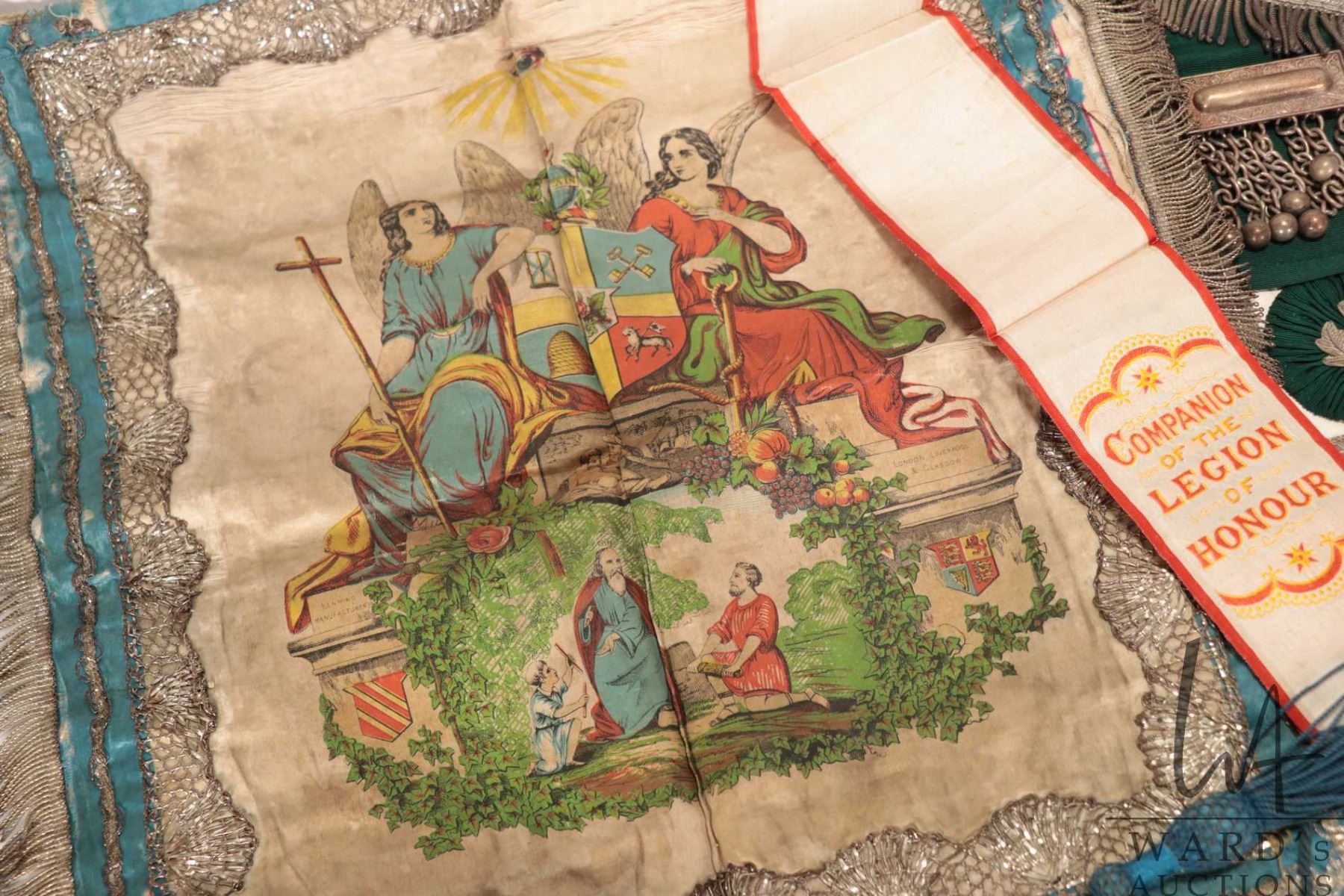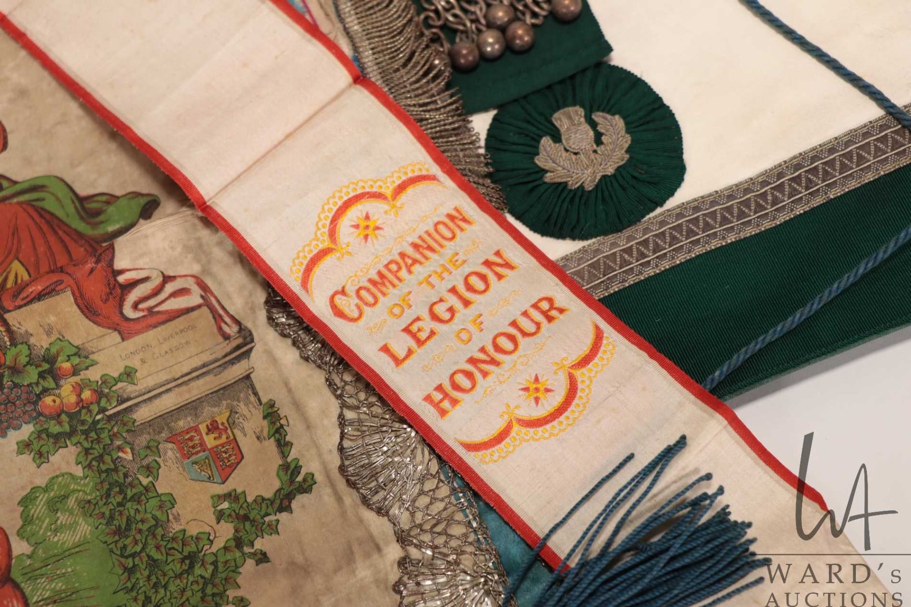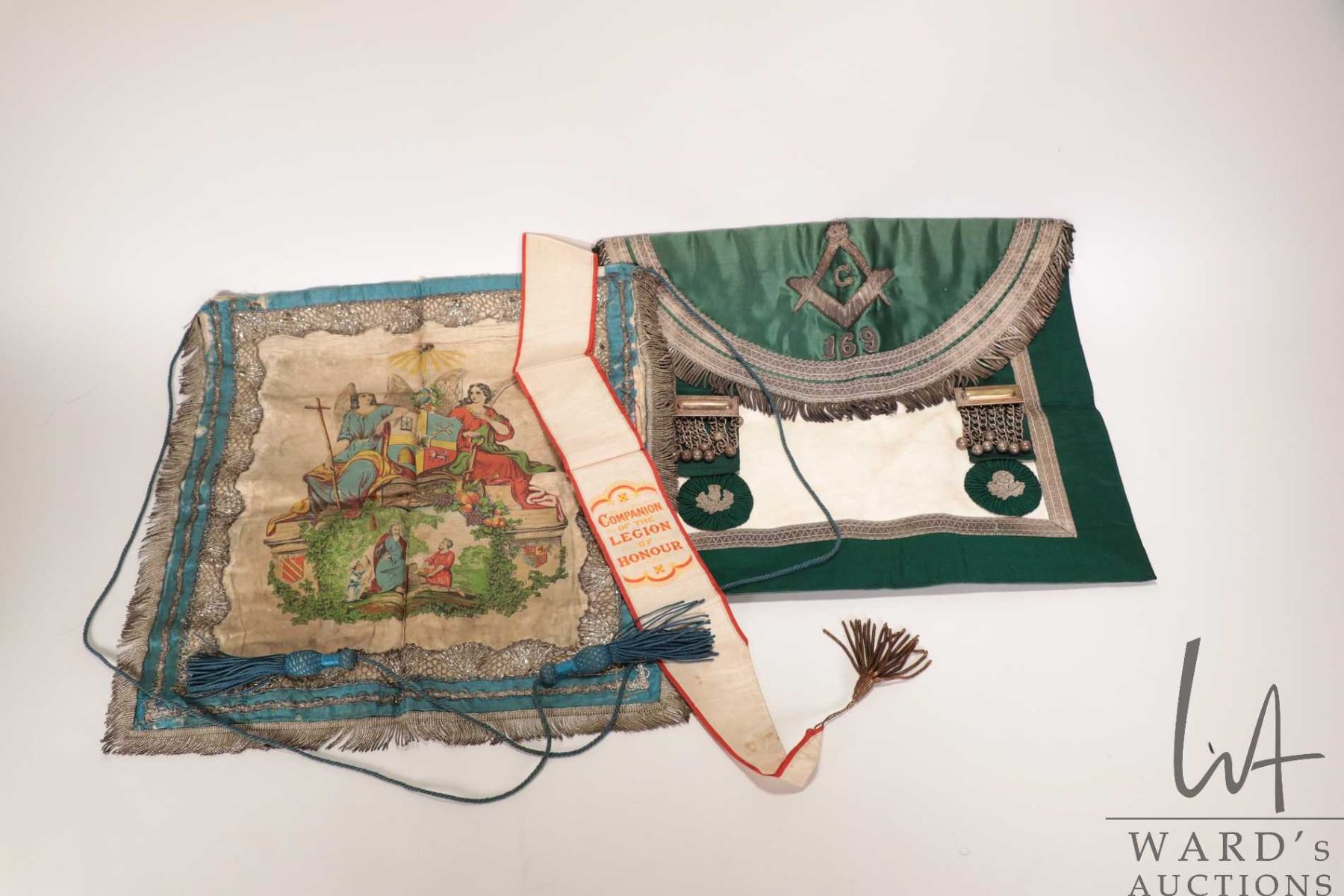 Selection of Regalia including antique Masonic kid leather and silk apron, decorated with silver thread fringing, silver-plate scroll work buckles and ball and chain tassels plus silver metallic bullion thread embroidered " G", compass and "169" with thistle and rose florettes ( a connection to Lodge Stivenstoune Thistle and Rose No. 169, a Masonic Lodge under the Grand Lodge of Scotland started in 1787) plus a silk fraternatiy banner from the Oddfellow ( Independent Order of Manchester Unity) Society, decorated with silver metallic bullion thread and silk tassels and an embroidered sash from the Independent Order of Rechabites ( a friendly society that promoted teetotalism) Salford Unity division, featuring silk embroidered and a metallic bullion tassel
