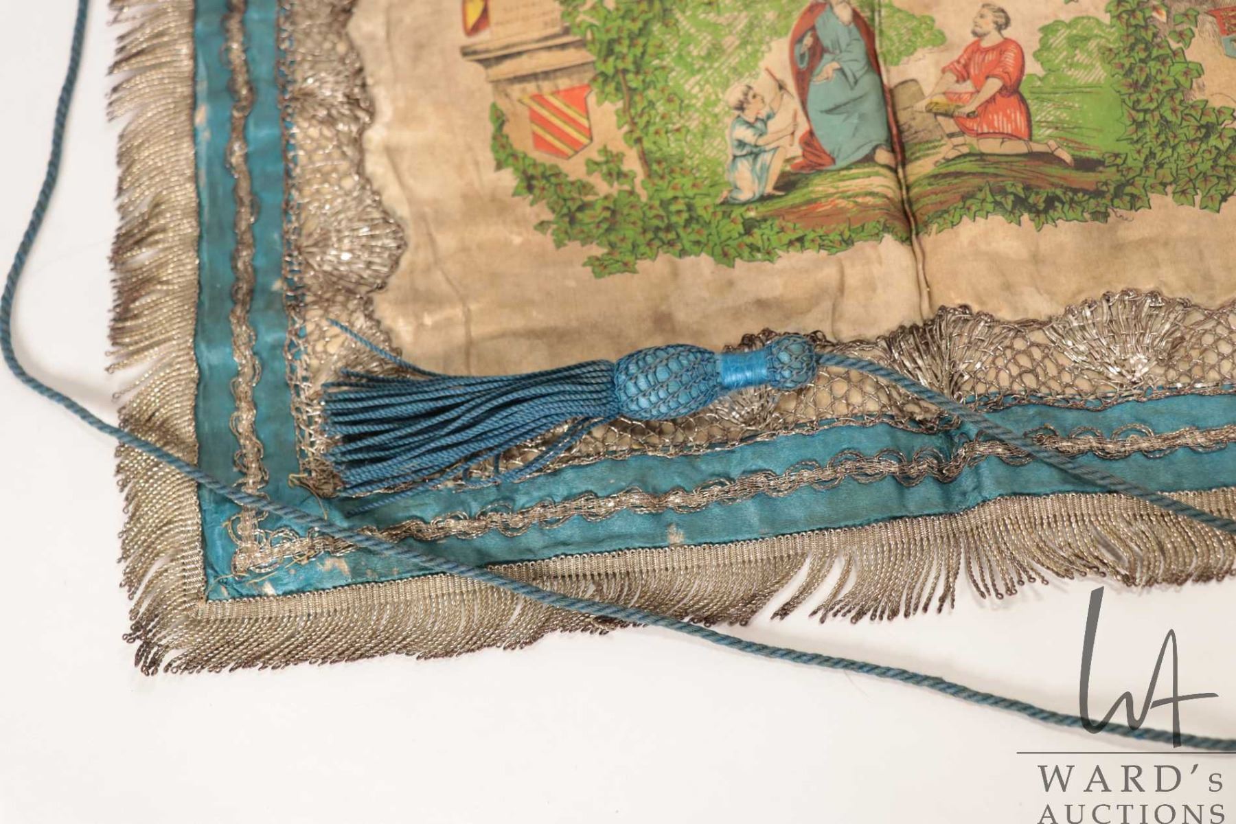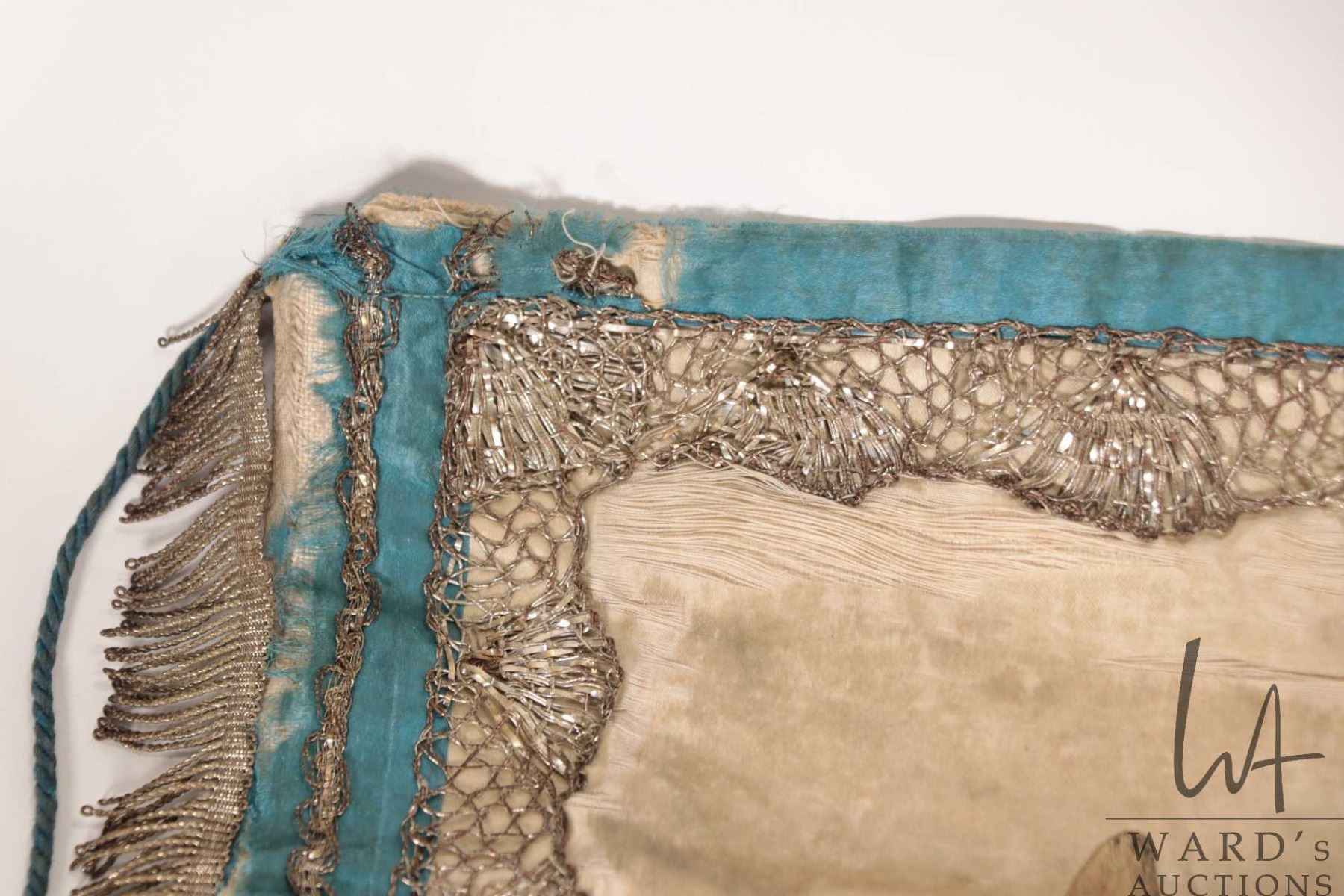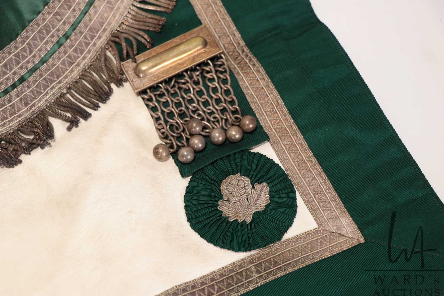 Lot 14 Selection of Regalia including antique Masonic kid leather and silk apron, decorated with silver thr