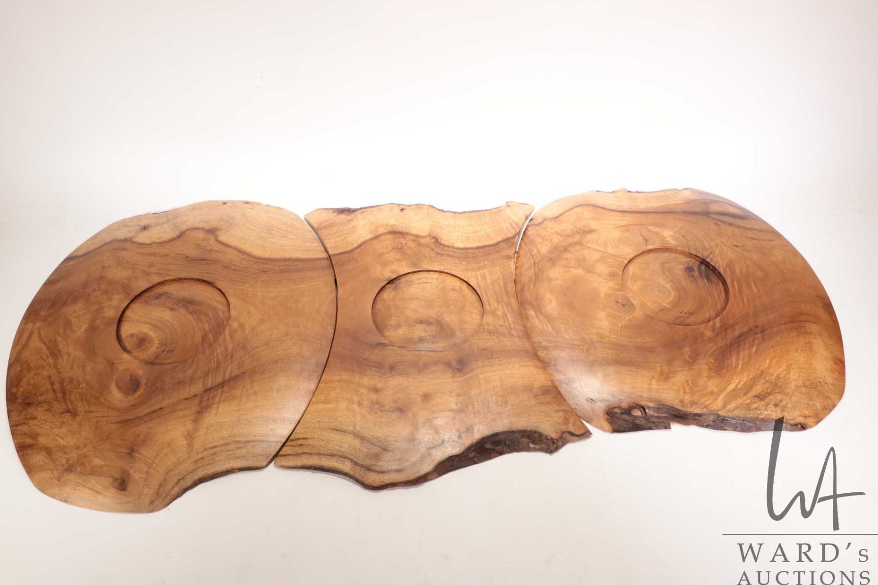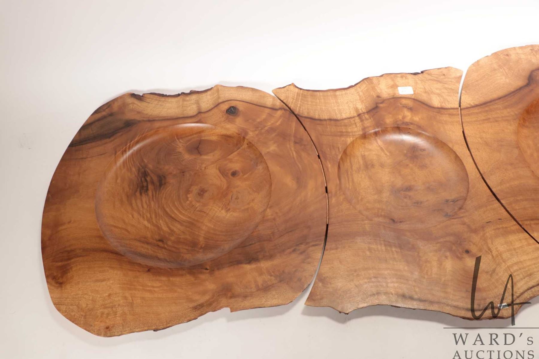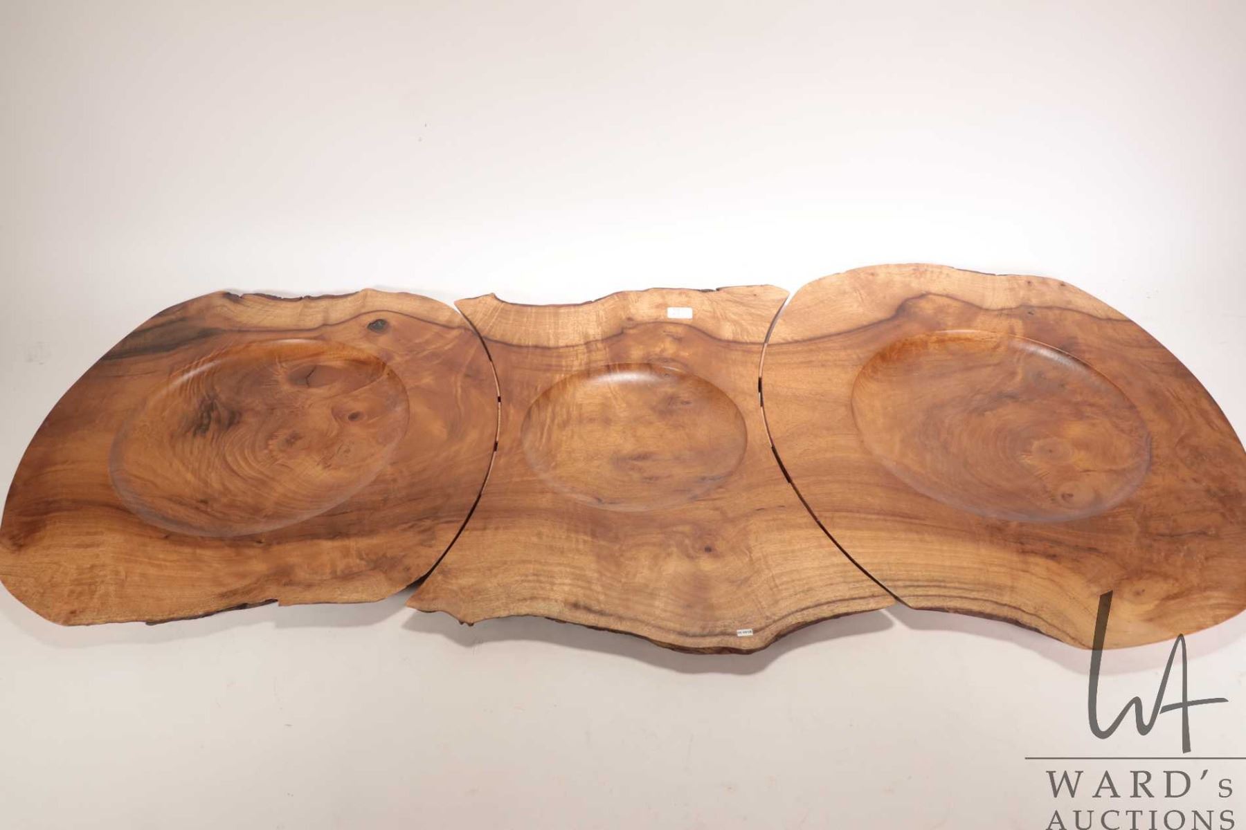 Brian McEvoy, artisan made decorative Myrtle wood with live edge, turned three section tray, numbered 418, 419 and 420, 45" in length and 21" in diameter and signed by this Edmonton based wood turner.
