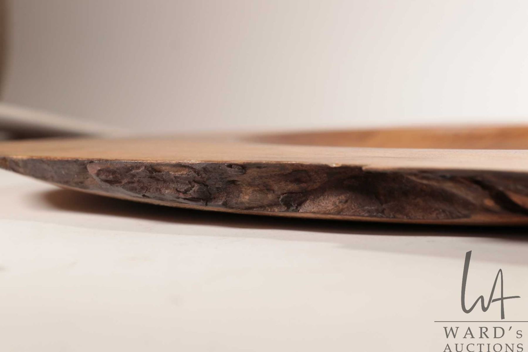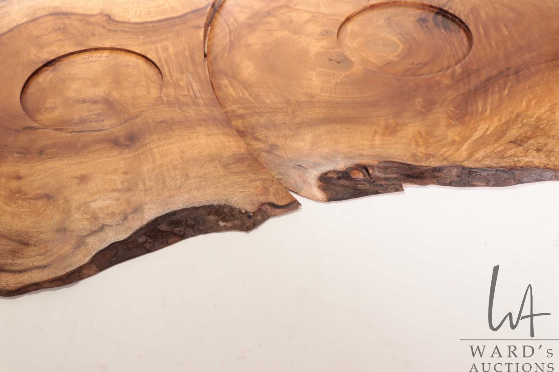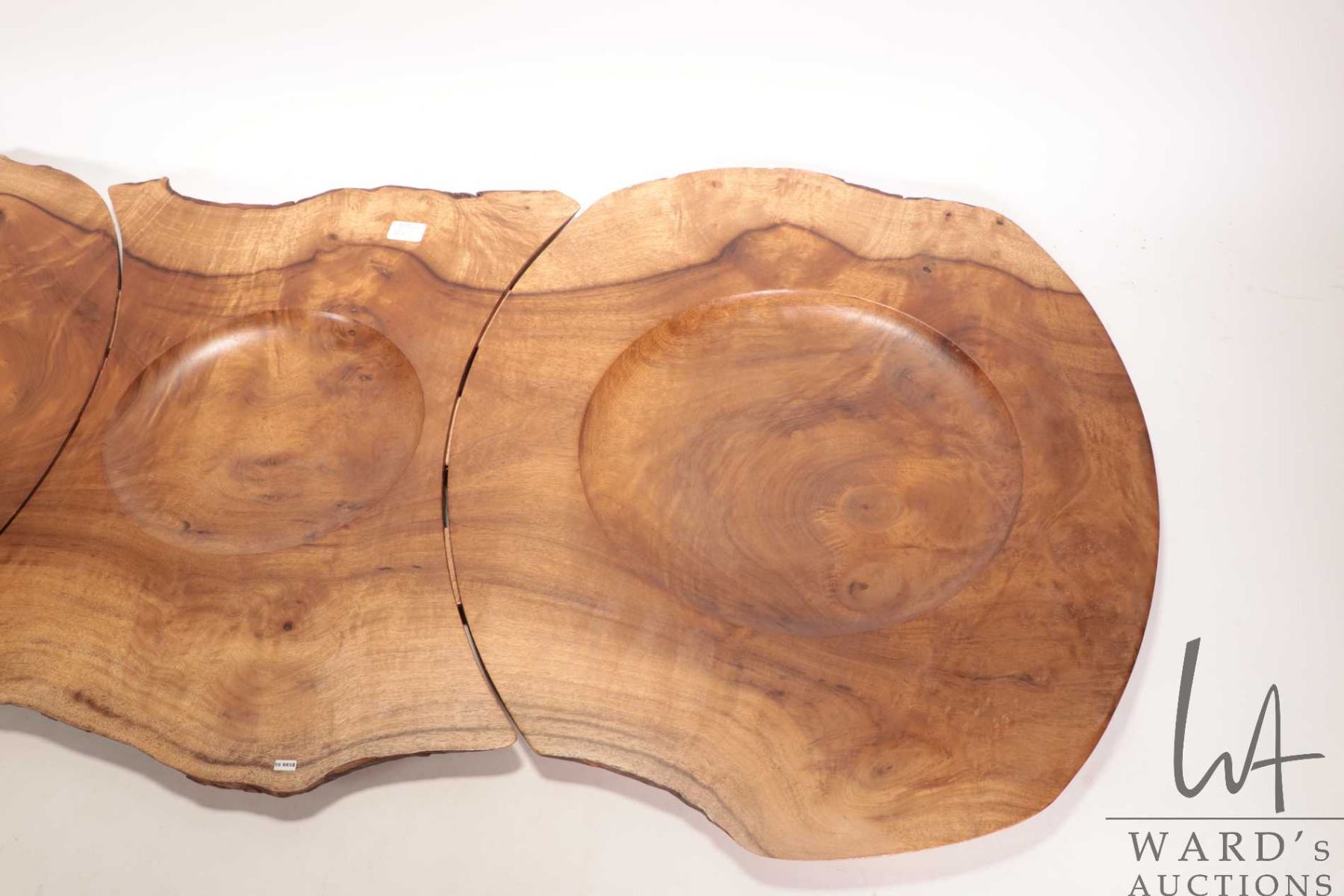 Brian McEvoy, artisan made decorative Myrtle wood with live edge, turned three section tray, numbered 418, 419 and 420, 45" in length and 21" in diameter and signed by this Edmonton based wood turner.