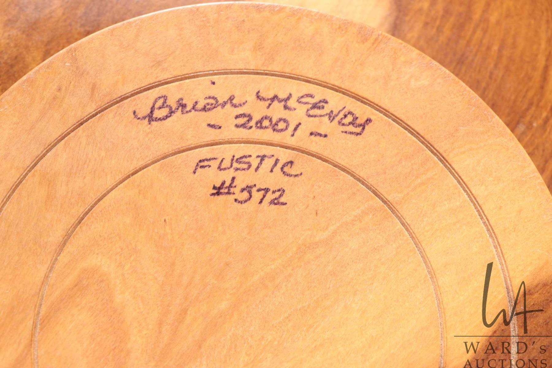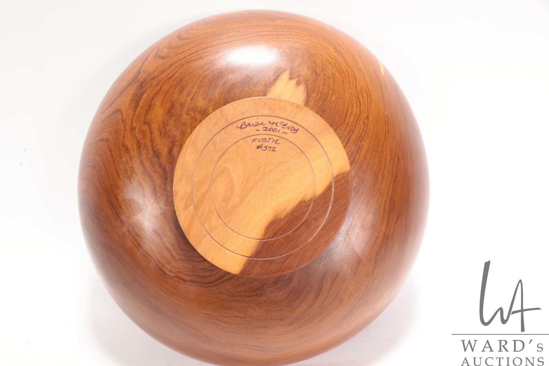 Brian McEvoy, artisan made decorative Fustic turned wooden bowl, 14" in diameter, 4 1/2' in height. Signed by artist, numbered 572 and dated 2001.