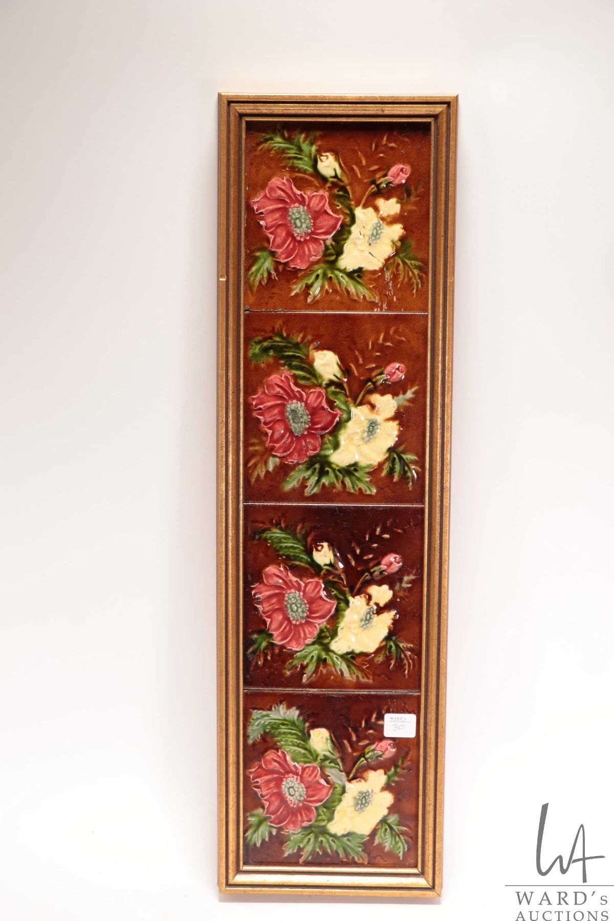 Lot 30 Framed set of four antique Arts & Crafts glazed floral tiles, overall dimensions 24 3/4" X 7"