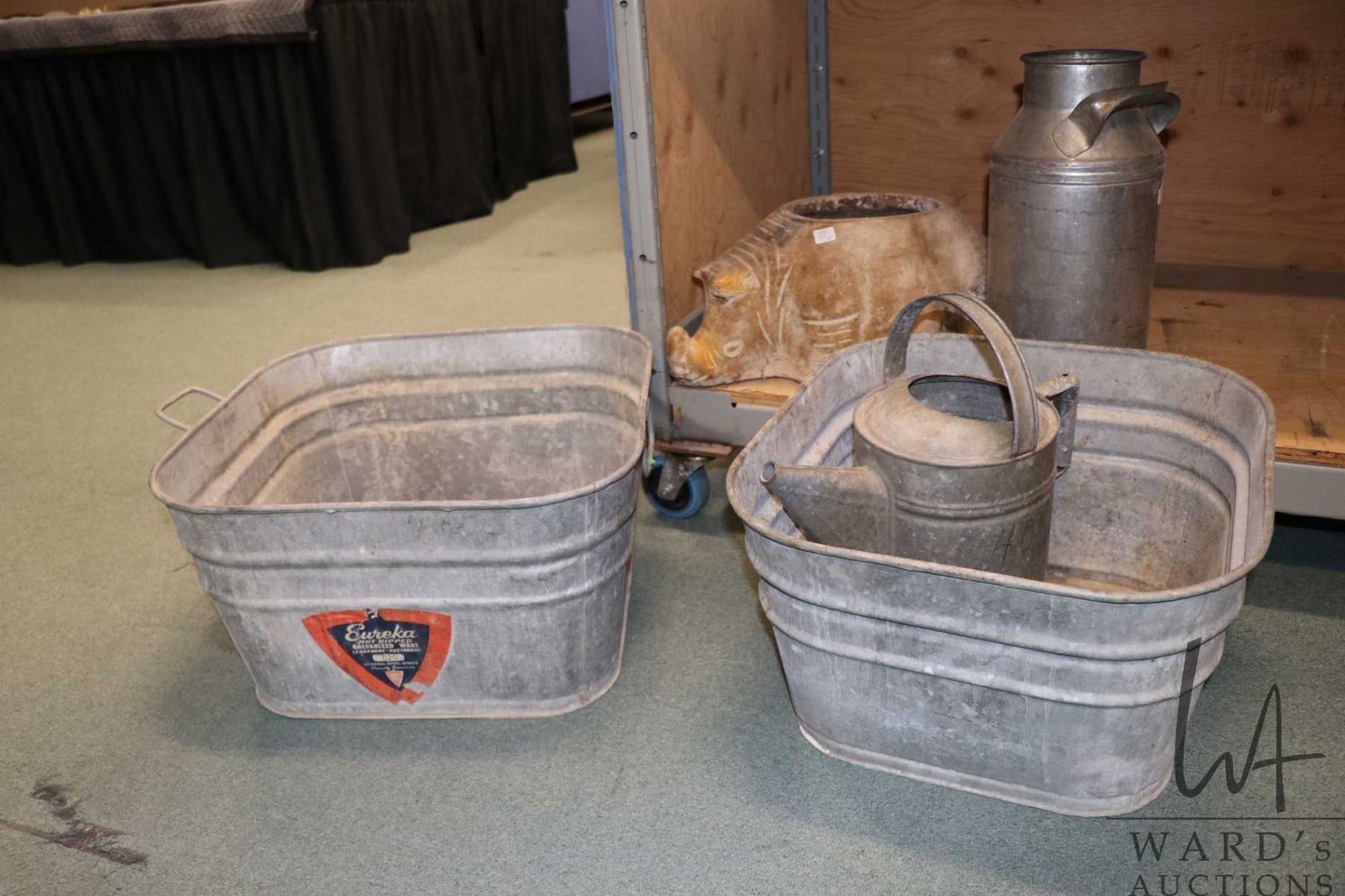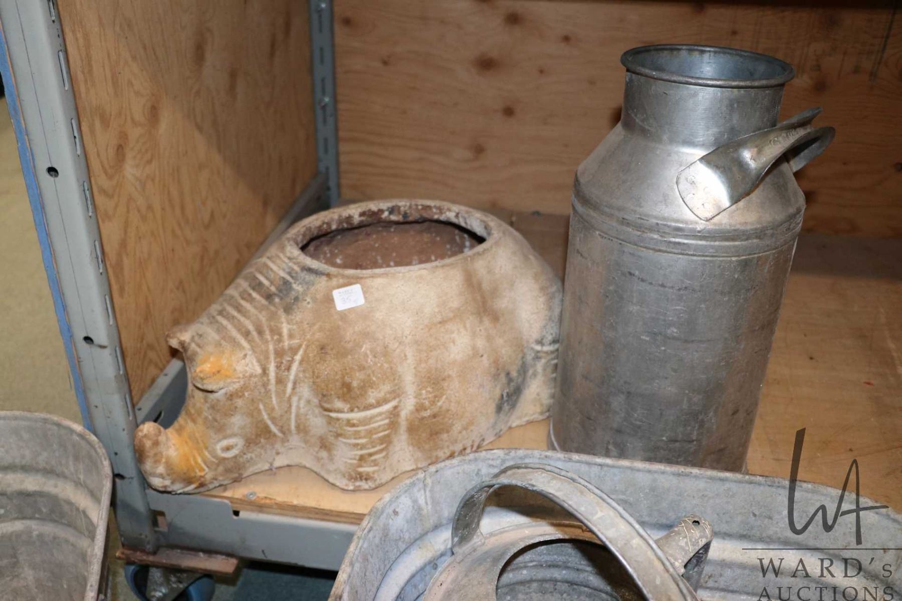 Four pieces of galvanized metal including Palm Edmonton 16" milk can, 10 quart watering can and two tubs including 18" with drain and a 21" square tub plus a pottery rhinoceros planter