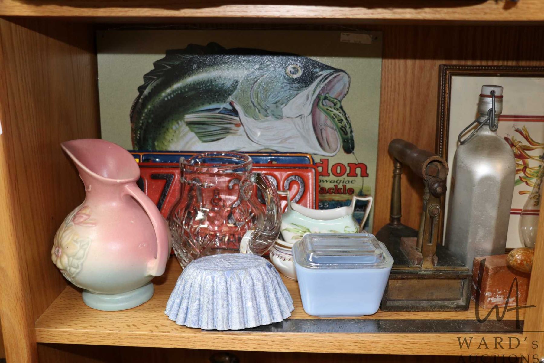 Shelf lot of vintage and antique collectibles including sadiron, one gallon stoneware crock, oil lamp, three American car license plates, crystal water jug, metal jelly mold, assortment on hand tools including hand drill, level, and a metal 24" tape measure, tin signs, framed floral print, and a framed miniature etching etc.