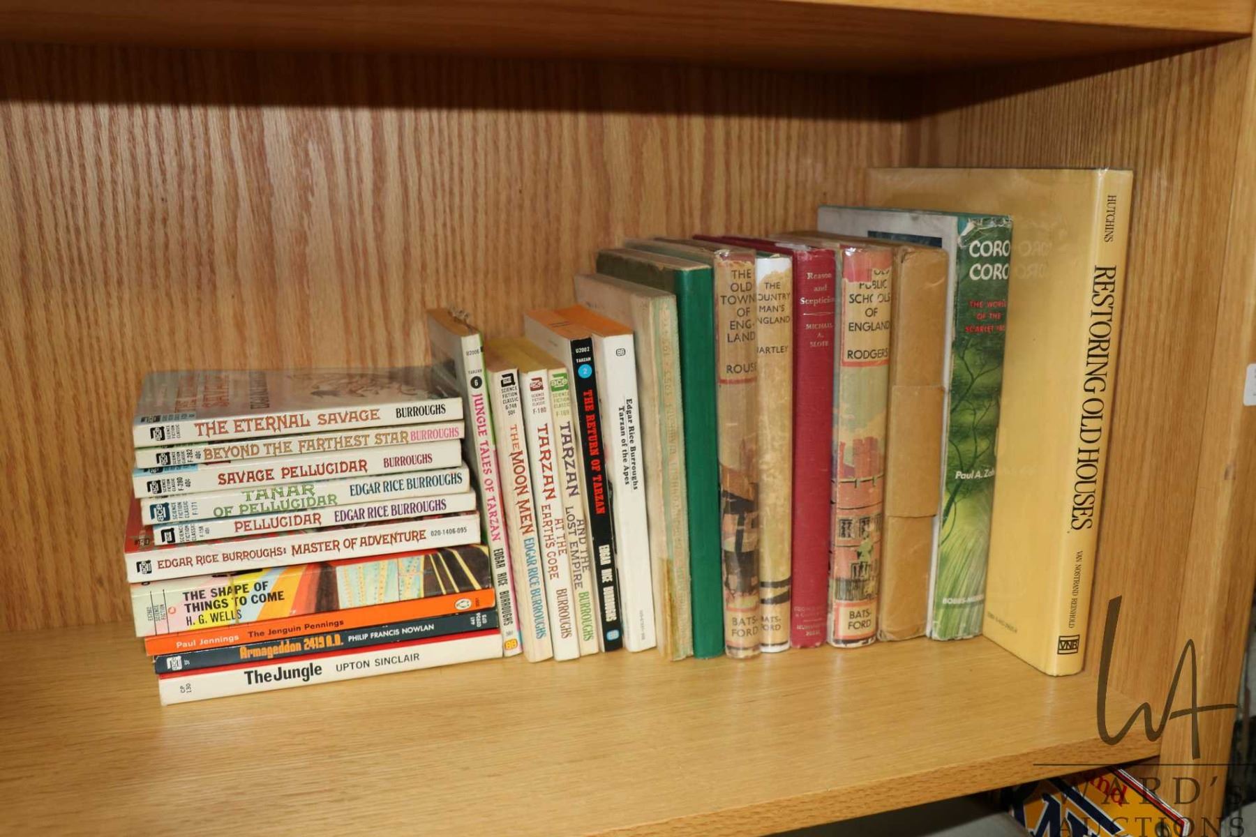 Selection of hardcover and soft cover books including English hardcover school books circa 1930-40's era, twelve Edgar Ric Burroughs paperbacks including Tarzan, hardcover book "Restoring Old Houses", Coro Coro bay Paul A. Zahl, Russian paperback chess book circ 1953-1954, British Museum "A Guide to Antiquities of the Bronze Age" with 195 illustratons, circa 1920, "The Illustrated Encyclopedia of Sex" etc.